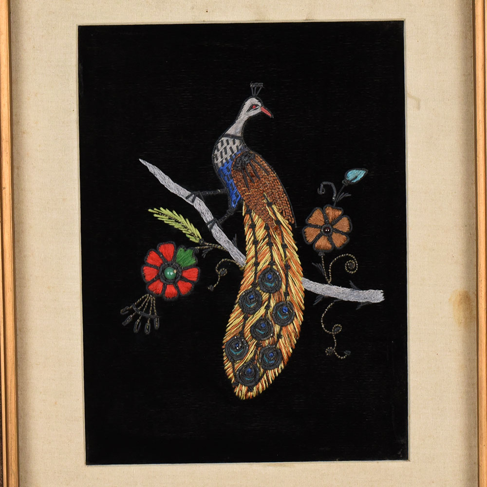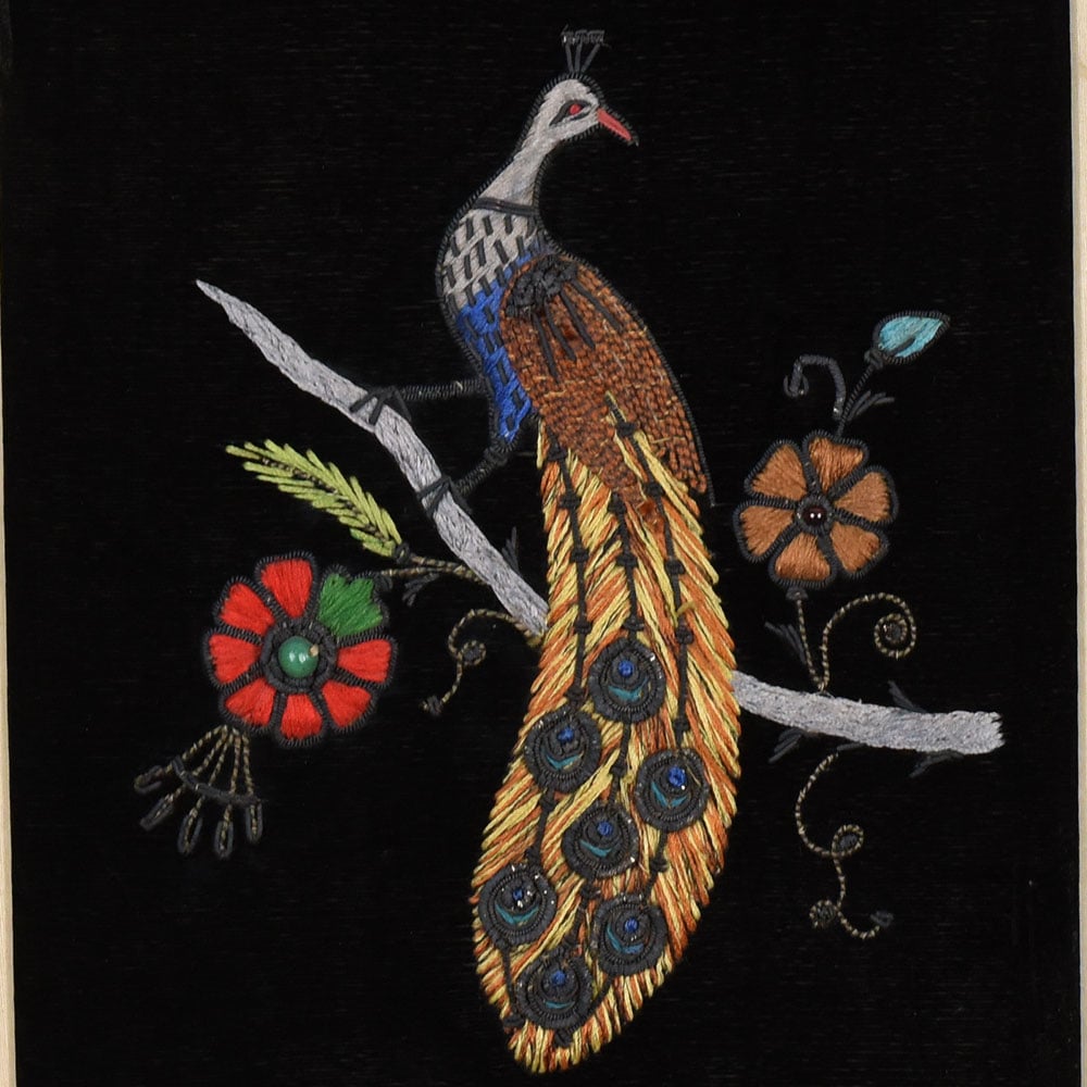 - Hand embroidery on cloth featuring a peacock motif