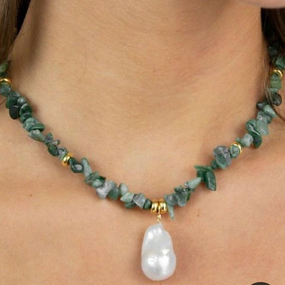 Keep the necklace dry and wipe gently after wearing to preserve the emerald’s natural texture and the luster of the pearl and gold plating.