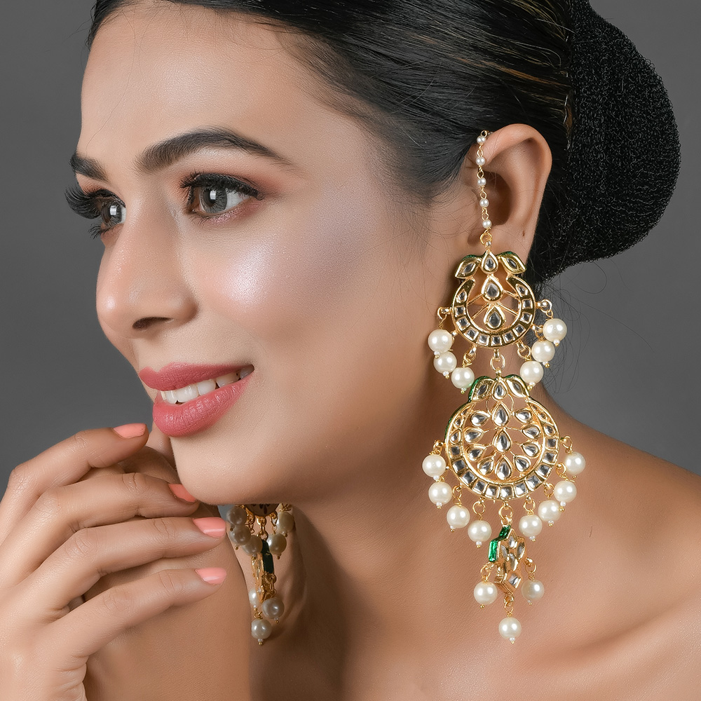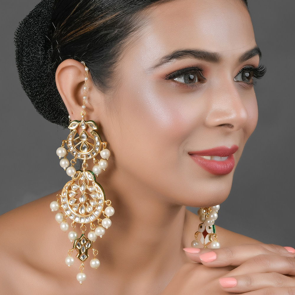 These earrings blend vibrant enamel work, pearl accents and green bead drops in an innovative ear-chain design that appeals to both traditional and modern tastes.