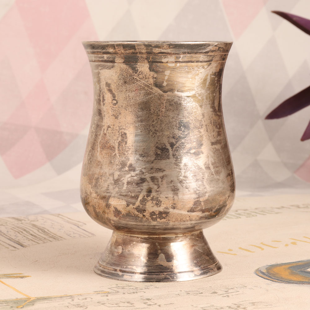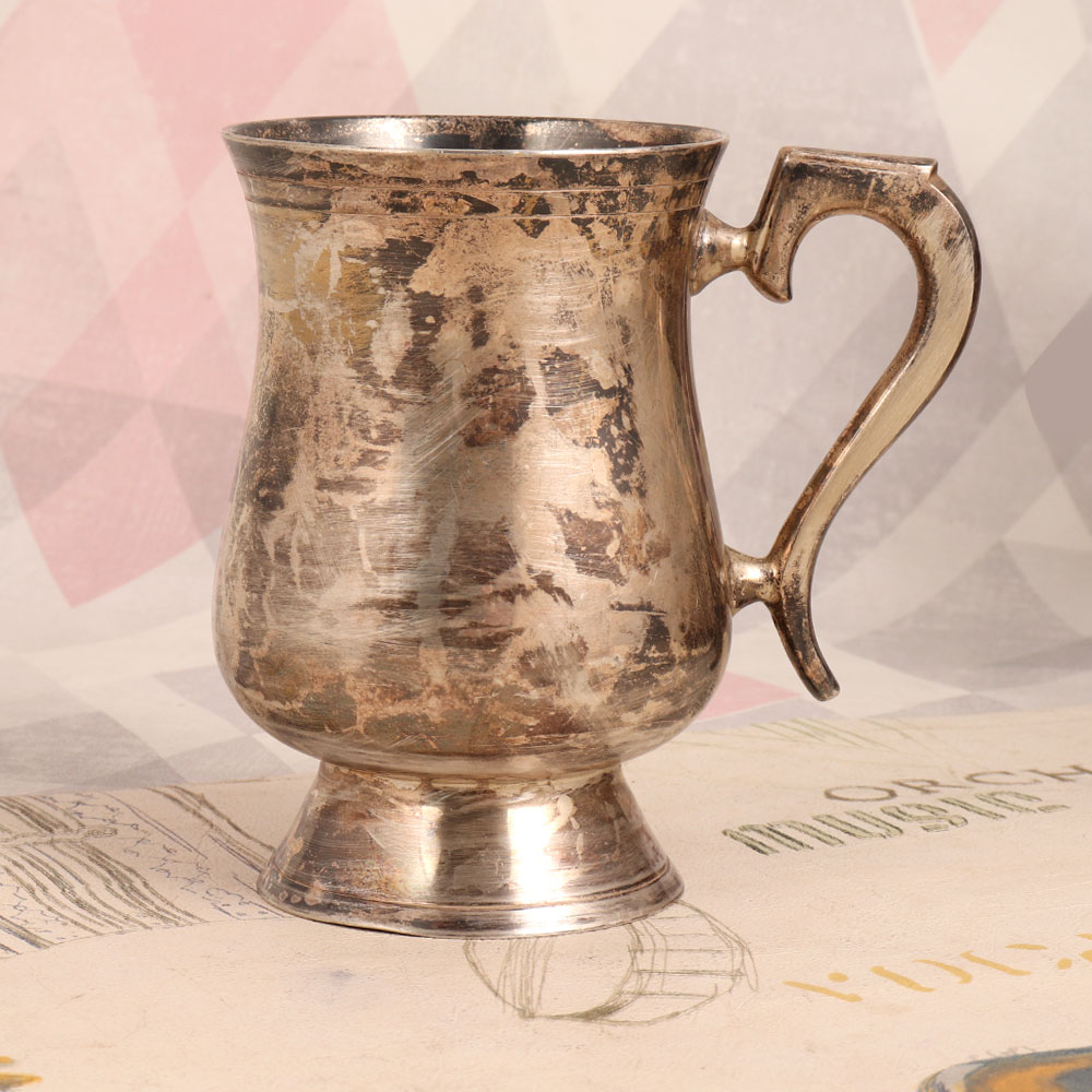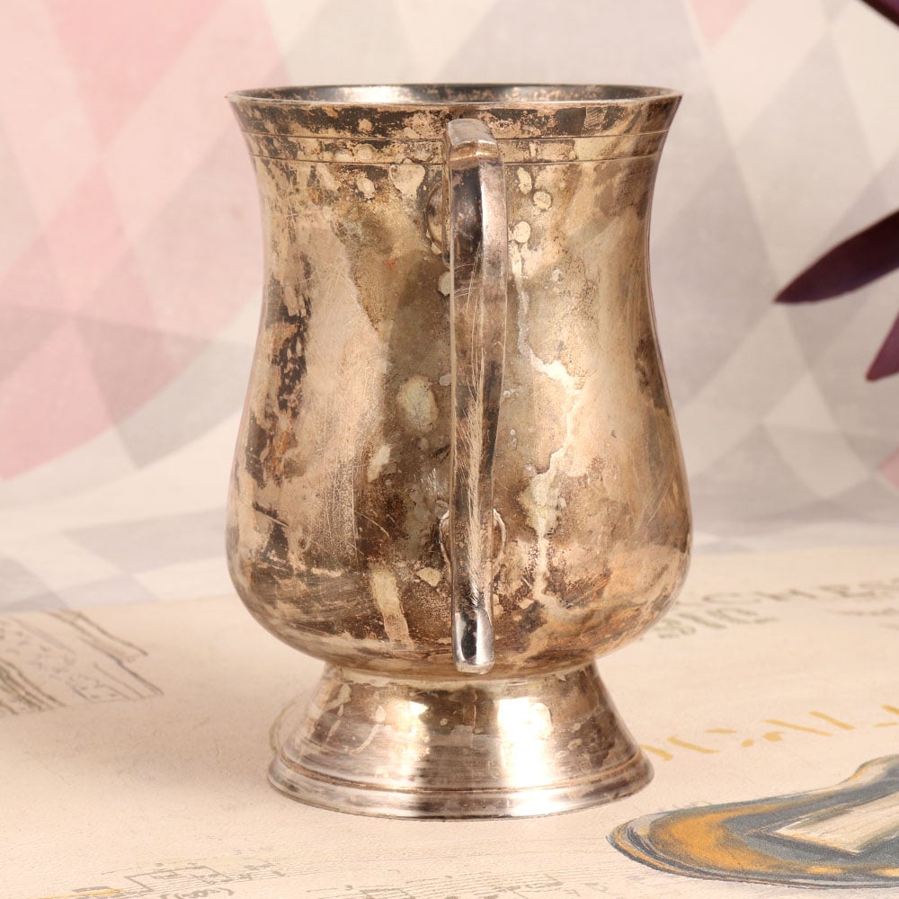 Enhance your decor with a touch of classic elegance by adding this exquisite vintage white metal mug to your collection. Meticulously crafted in the timeless English Art style, this mug exudes a sense of timeless charm. Made from high-quality white metal with a lustrous silver plating, it boasts a delicate sheen that catches the light, creating an aura of sophistication. The white metal mug is adorned with a meticulously designed handle and finished in an antique brown tone, highlighting the intricate craftsmanship of skilled artisans. Its unique aesthetic blends seamlessly with a variety of interior themes and styles, making it a versatile addition to your home, office, restaurant, hotel, cafe, or shop. However, please note that due to its vintage nature, we recommend using it primarily for decorative purposes. This mug is a remarkable addition to any vintage collection and serves as a thoughtful gift for your loved ones on special, festive, or auspicious occasions.