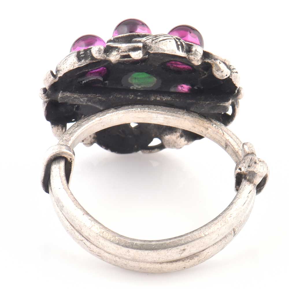 A very Unique design of 92.5Sterling silver ring with embossed motifs surrounding a circle made of round amethyst stone with an onyx stone in the centre . It is adjustable and can be worn in weddings, cocktail party, birthday party, anniversary, valentine day etc. Suitable for gifting your sister, friend , wife , niece and other female members of the family.