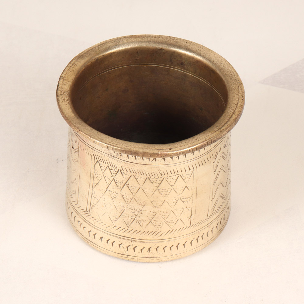 Immerse yourself in the timeless elegance of the vintage brass Panchpatra pot, a captivating vessel that will transform your ritual experience. Crafted with meticulous attention to detail, this stunning piece features intricate carvings that pay homage to the rich cultural heritage of South India. Infuse your rituals with a sense of reverence and tradition by incorporating this exquisite Panchpatra pot. Its timeless beauty and functional design make it a captivating centerpiece that will elevate the energy of your sacred practices. Whether you're looking to deepen your personal spiritual journey or create a visually stunning altar, this Panchpatra pot is the perfect addition to your ritual arsenal. Imagine the feeling of holding this stunning vessel in your hands, its weight and heft a testament to its quality craftsmanship. As you fill it with water, flowers, or other offerings, you'll be transported to a world of ancient wisdom and cultural richness. With the Panchpatra pot as your guide, you'll unlock a new level of connection to the divine and the traditions that have sustained generations before you.