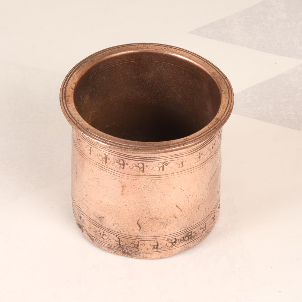 Discover the captivating allure of the Vintage Copper Panchpatra Pot, a masterpiece of South Indian art that will transform your rituals into moments of pure enchantment. Crafted with meticulous attention to detail, this exquisite pot embodies the rich cultural heritage of the region, infusing your sacred practices with a timeless essence. Elevate your spiritual journey with the Vintage Copper Panchpatra Pot. Its captivating presence will create a serene and sacred atmosphere, allowing you to connect with the divine on a deeper level. Infuse your rituals with a sense of reverence and timelessness, as the pot's timeless beauty and craftsmanship transport you to the heart of South Indian tradition. Whether you're a seasoned practitioner or embarking on a new spiritual path, this Panchpatra pot will become a cherished companion, enriching your life with the power of ritual and the beauty of South Indian art. Bring home this exquisite piece and let it become the centerpiece of your sacred space, where the past and present converge in a harmonious celebration of the divine.