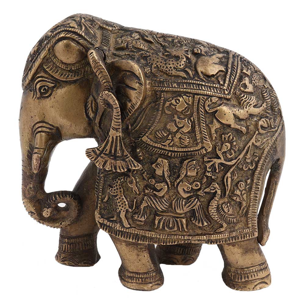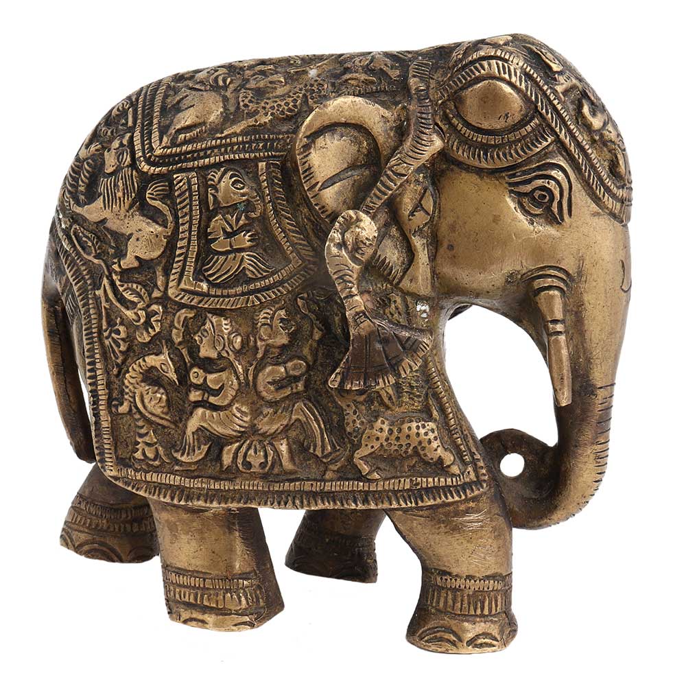 Engraved Brass Elephant Statue Trunk Up Showpiece