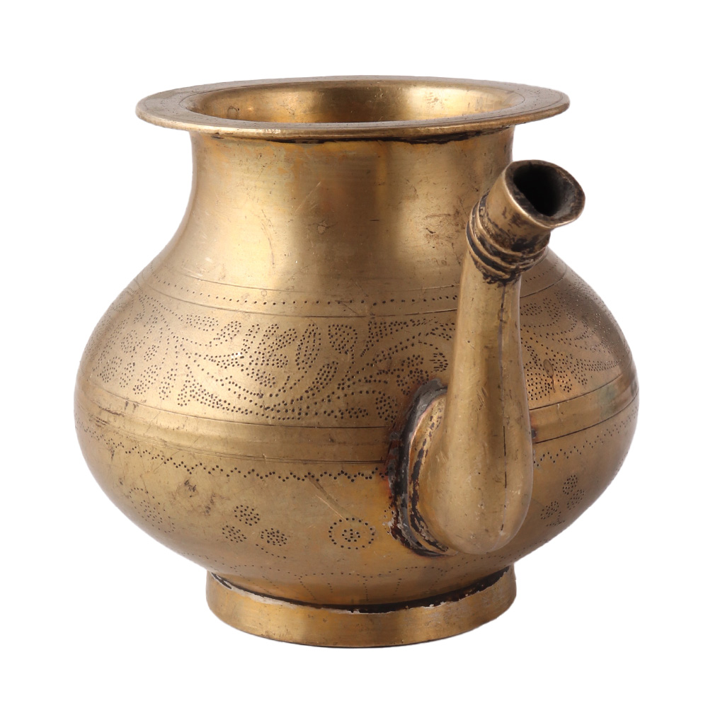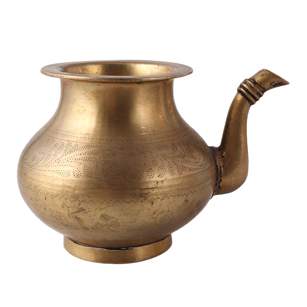This old ceremonial holy water pot was once used for ablution by Hindus. This Beautiful floral-engraved water pot is made in the Islamic style by skilled Indian artisans. This exquisite hand-engraved pot features an exclusive floral design that covers the entire surface and is ready to become a part of your royal collection. This brass pot with a spout is frequently used as a showpiece, hotel decoration, home decoration, shop decoration, stage decoration, and in wedding rituals in addition to being used to store holy water. The pot has a spout that is attached to one side of the pot; it has a bottom rim for support and a big belly to hold water. It is perfect for gifting.
