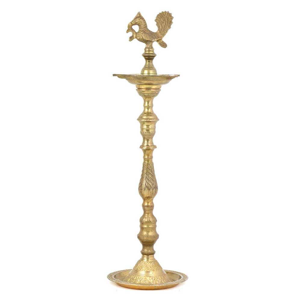 Traditional ornamental brass oil lamp that are very long with a stand. The lamp has a five faced diya with a peacock figurine on the top that gives it a very traditional look. It is lit during diwali or any other religious functions like wedding or other important functions.