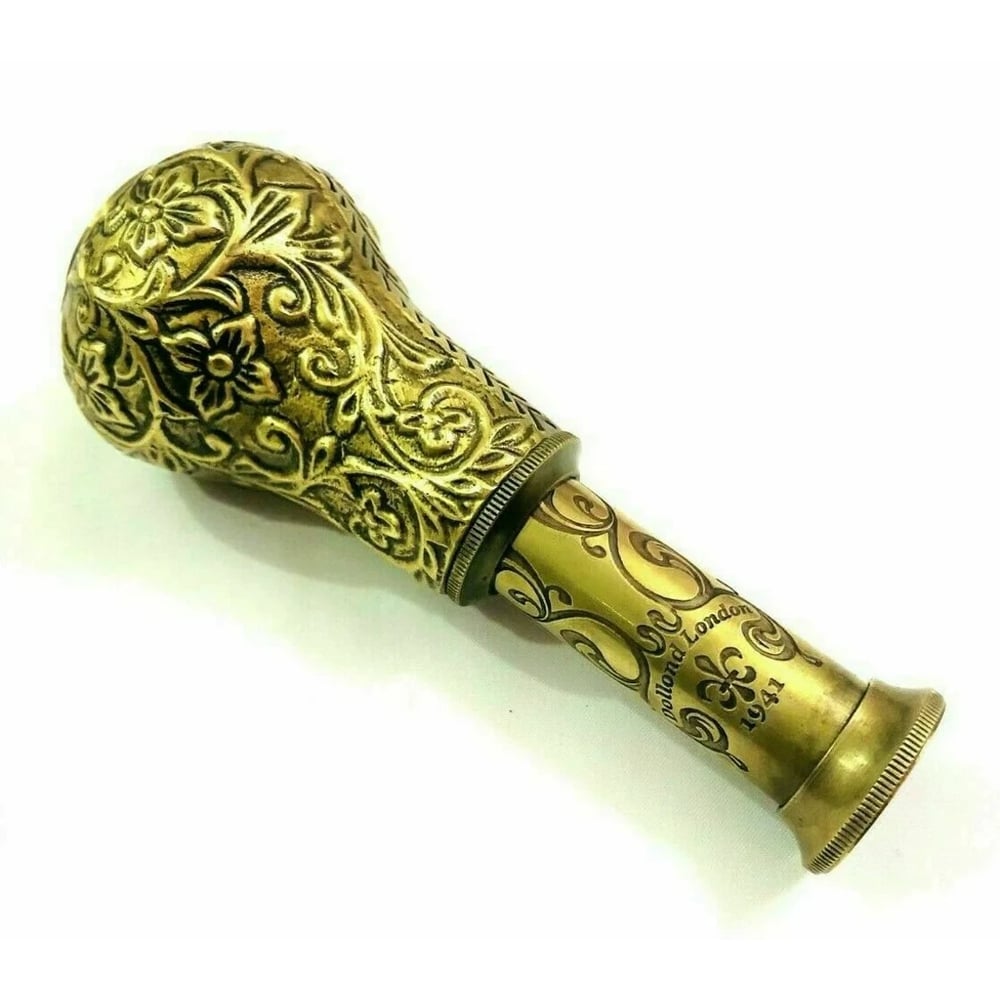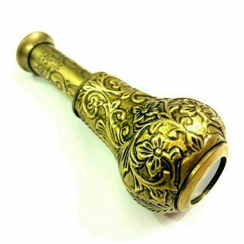 This brass spyglass features detailed engraving and a sculpted form that enhances its antique appeal, making it ideal for collectors and dcor enthusiasts.