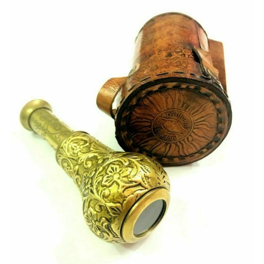 This handcrafted engraved brass spyglass is a refined collectible that blends artistic craftsmanship with vintage nautical charm. Designed with intricate engraved patterns and paired with a premium leather case, this piece reflects timeless elegance and serves as a distinctive dcor accent or thoughtful gift.