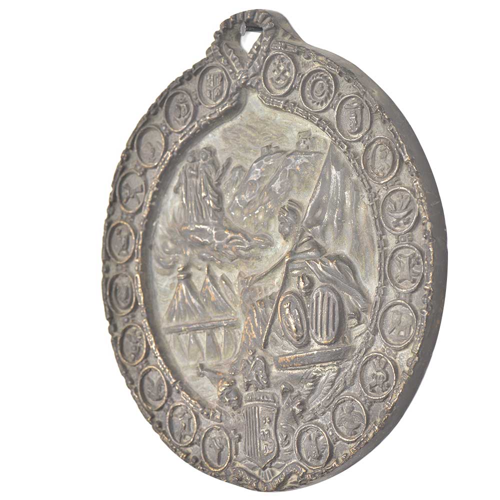 This is a rare hand made and engraved village scene and temple scene on a brass pendent . It has a circular border with many small engraved designs in smaller circles . This vintage brass locket is a wonderful collectors item and gifting option.