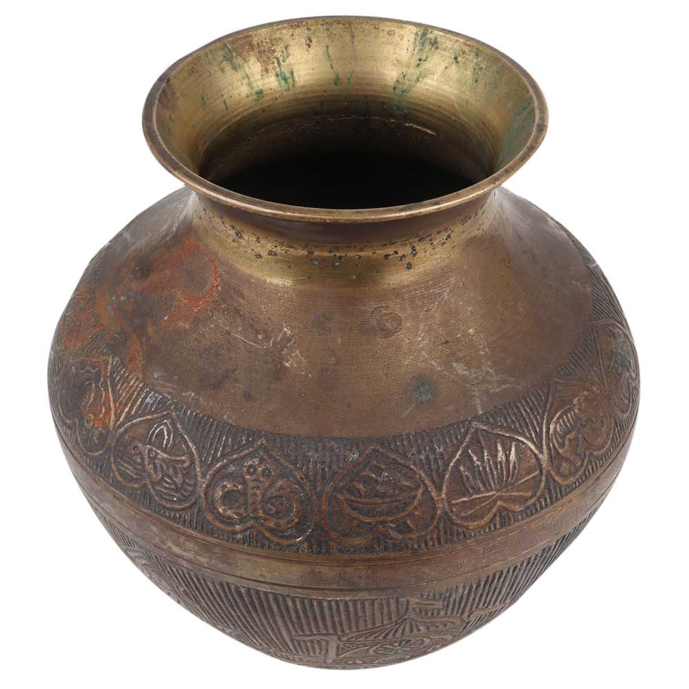 This handmade holy water pot was used to store holy water and sprinkled in the entire house or temples or other places of worship and the left over water was then poured in the basil plant to raise or enrich itself. Crafted from excellent quality metal these water Lota Pots are made by expert artisans and have delicate engraving all around the vessel.