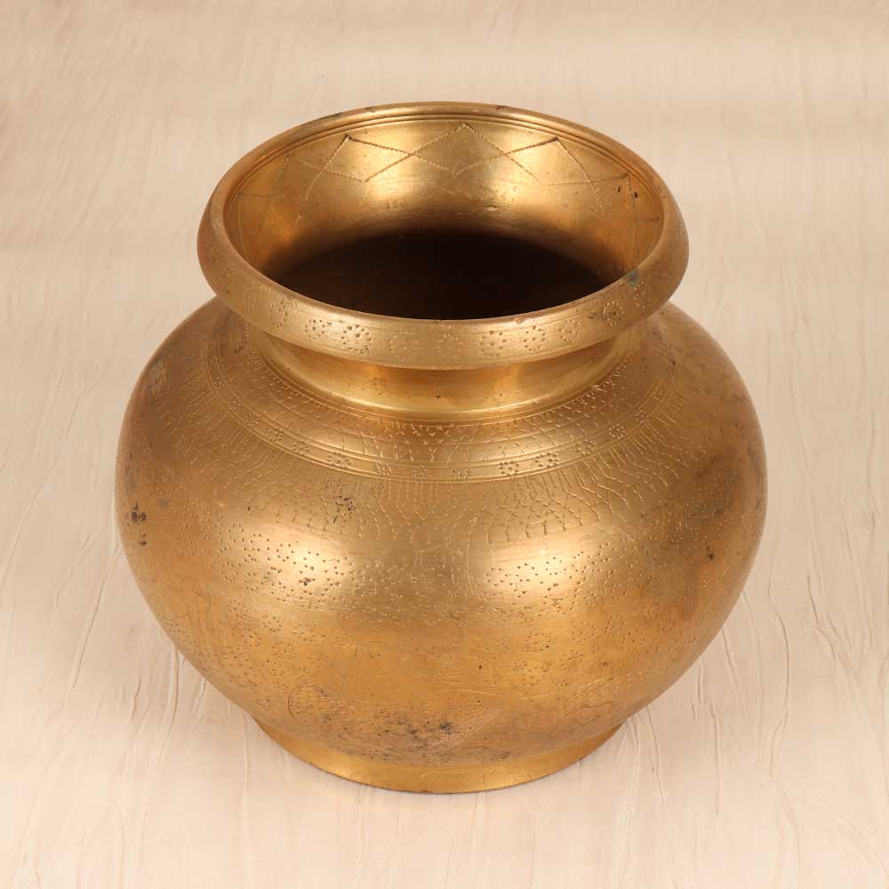 Transport yourself to a sacred place with this stunning vintage brass holy water pot. Lovingly engraved with traditional Gujarati art, this vessel evokes spirituality and ritual. Let its intricate patterns and elegant form grace your home altar, adding warmth and meaning to your sacred space. When filled with holy water, this pot becomes a focal point for contemplation and prayer. Use it to bless yourself and your home, connecting to heritage and higher purpose. Its cool, smooth brass feels soothing against your fingertips as you dip them in the purified water. For those drawn to ritual and intentional living, this holy water pot makes a meaningful addition to spiritual practice. Display it prominently so its beauty elevates your surroundings, as the water it holds uplifts your soul. Revere something timeless by bringing this vintage piece into your daily devotionals.
