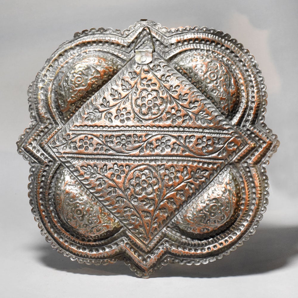 This engraved Copper floral decorative plate features intricate traditional metalwork inspired by classic Indian ornamental design. The plate is richly decorated with symmetrical floral patterns, geometric shapes, and finely detailed borders that showcase the craftsmanship of traditional Copper artisans. At the center of the plate is a striking diamond-shaped motif filled with delicate floral engravings. Surrounding this central design are layered ornamental borders and curved sections filled with repeating floral patterns, creating a visually balanced and decorative composition. The raised detailing adds texture and depth, giving the plate a distinctive handcrafted appearance. Made from Copper with an aged silver-toned finish, the surface displays natural patina and warm copper undertones that highlight the engraved patterns. This aged finish enhances the antique aesthetic of the plate while emphasizing the fine decorative work across its surface. Decorative plates of this style are traditionally used for serving dry items, presenting offerings during rituals, or displaying as ornamental decor. The artistic engraving makes the piece equally suitable as a collectible or decorative accent. Perfect for traditional home decor, festive table settings, spiritual offerings, or antique collections, this engraved Copper plate combines functionality with heritage-inspired craftsmanship.