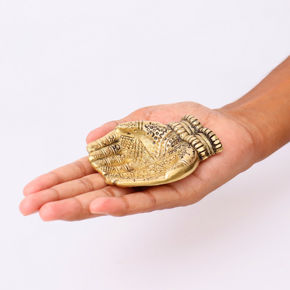 Indianshelf.com for bulk/wholesale orders.Indianshelf.us for personal purchases.Bring home divine energy with the Engraved Design Two Hands Brass Diya Oil Lamp, a beautiful creation where two sculpted hands gracefully cradle the sacred flame. Made from solid brass with a golden polish, this diya combines artistry and spirituality, reflecting the offering of light to the divine. Perfect for temples, home mandirs, and festive occasions, it stands as a reminder of devotion and blessings.