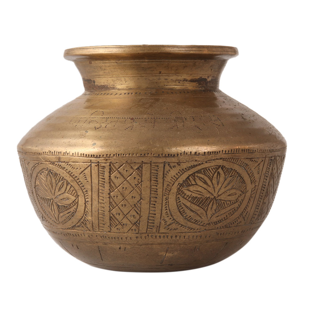 The impeccably engraved Gangajal water lota pot is made of bronze. It has beautiful chequered patterns and flowers on the bottom half. It has a glamorous look to it. A must have for your vintage collection.