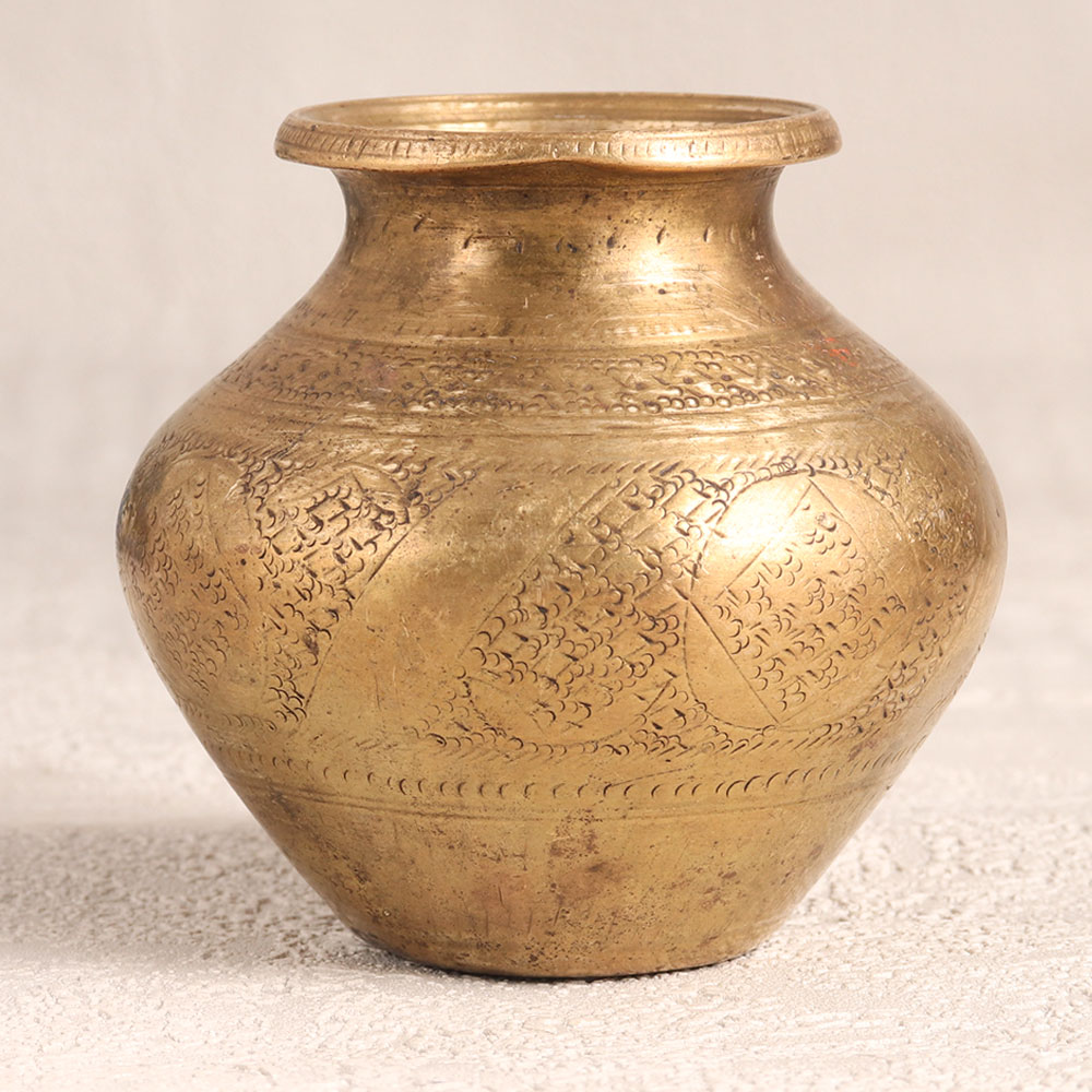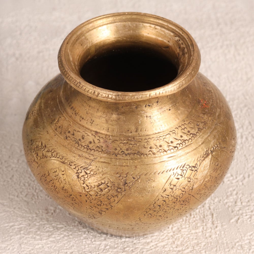 This Vintage Brass Holy Water Pot is a magnificent piece handcrafted by highly skilled Indian artisans hailing from the historic state of Gujarat, India. Crafted with meticulous precision, this holy water pot exudes the essence of traditional artistry and spirituality. Forged from high-quality brass, the pot is characterized by an antique golden finish that not only adds a touch of opulence but also showcases intricate engravings that tell a story of devotion and heritage. This timeless piece is a beautiful addition to any space – be it your home, office, hotel, cafe, shop, or restaurant prayer room. Its versatility is truly captivating, as it can be used both as a sacred vessel during prayer and as a charming small flower pot. Placing it in your space is believed to infuse positive energy, promoting harmony and serenity within your surroundings. Furthermore, this vintage brass holy water pot is a collector's dream, adding a touch of history and culture to your collection. It can also be an impressive exhibit at an antique showcase or exhibition. Share the beauty and spirituality of this masterpiece with your loved ones on special, festive, or auspicious occasions.