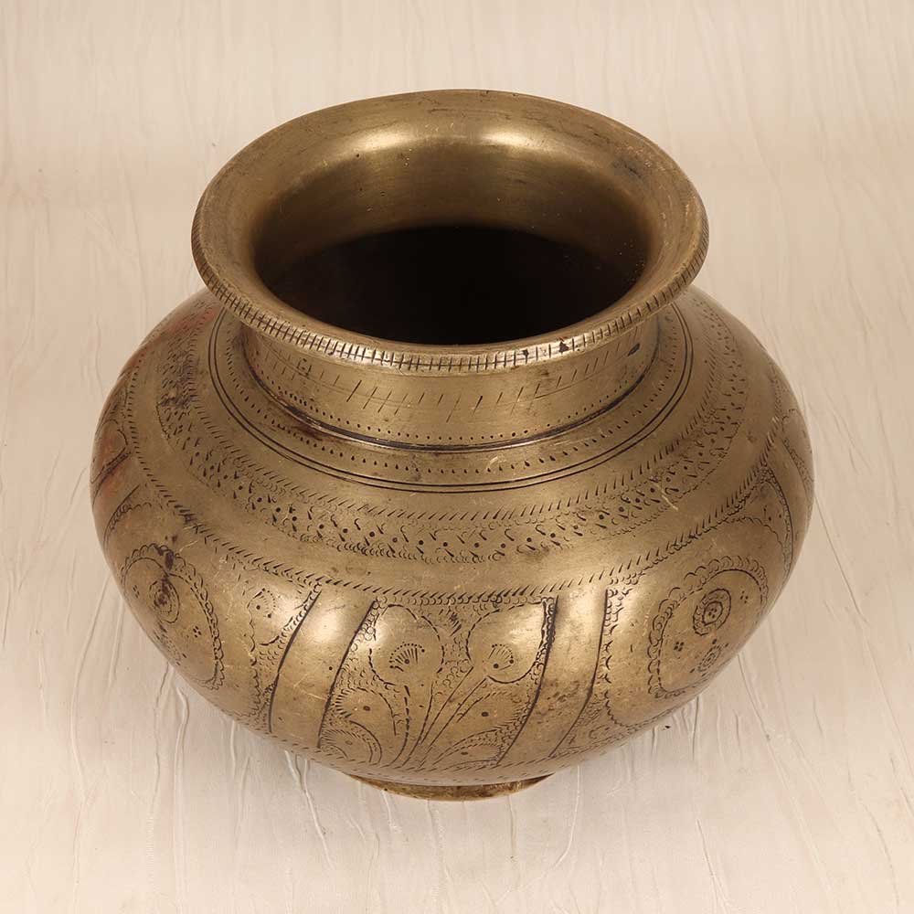Bring home the beauty of Rajasthan with this vintage brass holy water pot. This handcrafted piece features intricate floral engravings characteristic of the region's artistic heritage. Let it add a touch of spirituality and old-world charm to your home decor. This special vessel allows you to store and pour holy water in a reverent manner. Place it in your puja room or prayer space to enhance your rituals. The vintage look gives it a timeless appeal that will complement both traditional and modern home interiors. Gift it to newlywed couples or for housewarming celebrations.