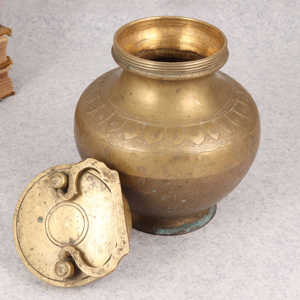 Enhance your spiritual space with the timeless allure of the Vintage Brass Gangajali Pot. Crafted by highly skilled Indian artisans from premium brass, this sacred vessel boasts exquisite engravings and a distinguished antique brown finish, capturing the essence of traditional craftsmanship. Designed with a secure lid and a gracefully adorned handle, this pot mirrors the elegance found in temples and is an ideal addition to home, office, restaurant, hotel, or cafe prayer rooms. Versatile and ornate, the Gangajali Pot serves not only as a ritualistic accessory but also as a captivating decorative piece, perfectly blending spirituality with aesthetic charm. Handmade with precision and care, it's a testament to India's rich artisanal heritage. Whether you're building a vintage collection or seeking a unique gift for a loved one on special, festive, or auspicious occasions, this pot embodies cultural significance and timeless beauty.
