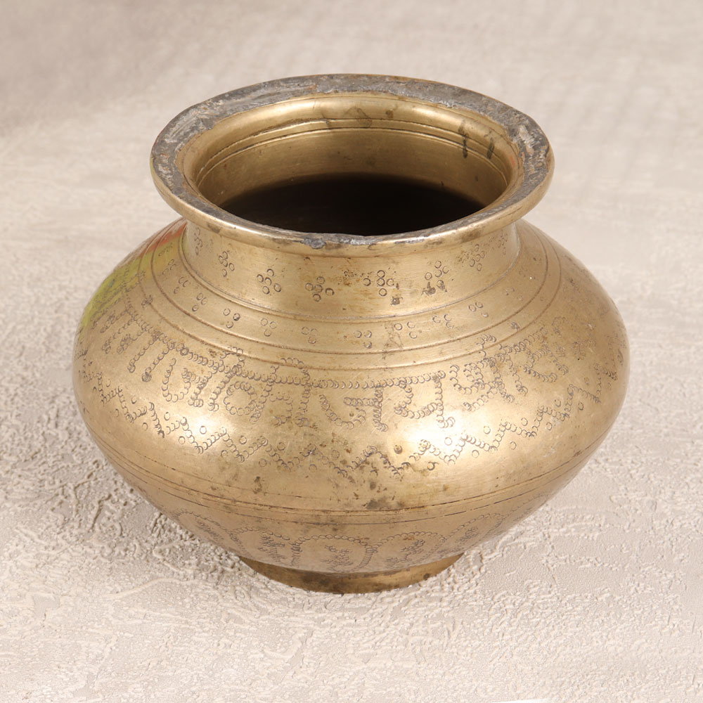 Decorate your home interior with this exquisite Vintage Brass Holy Water Pot from the skilled artisans of Gujarat, India. Handcrafted with precision, this lota features intricate carvings that add a touch of timeless elegance to your prayer, havan, or auspicious occasions. The antique brown finish lends a rustic charm, showcasing the artistry of high-quality Brass. Versatile in its use, it gracefully cradles holy water during rituals and serves as a delightful vessel for flower decorations. Embrace the heritage of Indian craftsmanship as you display this piece in your home, office, restaurant, hotel, or cafe, instantly transforming any space into a haven of serenity and cultural richness. This handmade masterpiece is not just a decorative item but a symbol of tradition and reverence. Ideal for collectors of vintage treasures, this holy water pot is a unique addition to your ensemble. Share the blessings by gifting this artisanal marvel to your loved ones on special, festive, or auspicious occasions.