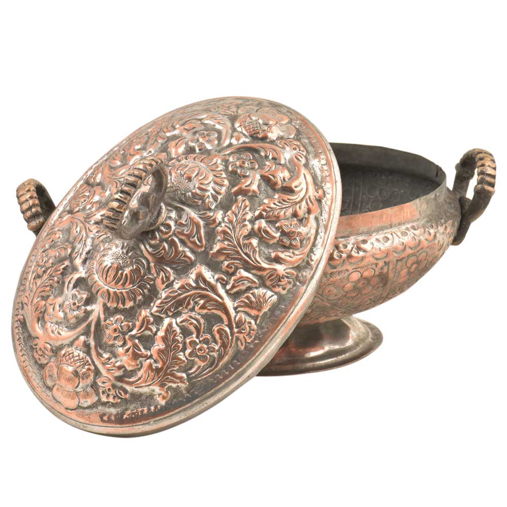 Engraved Kashmiri Copper Rice Bowl With Lid And Handles
