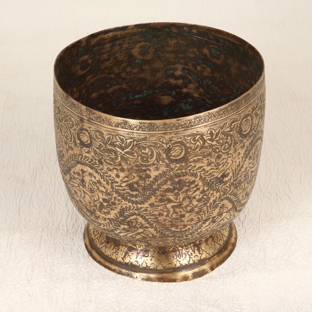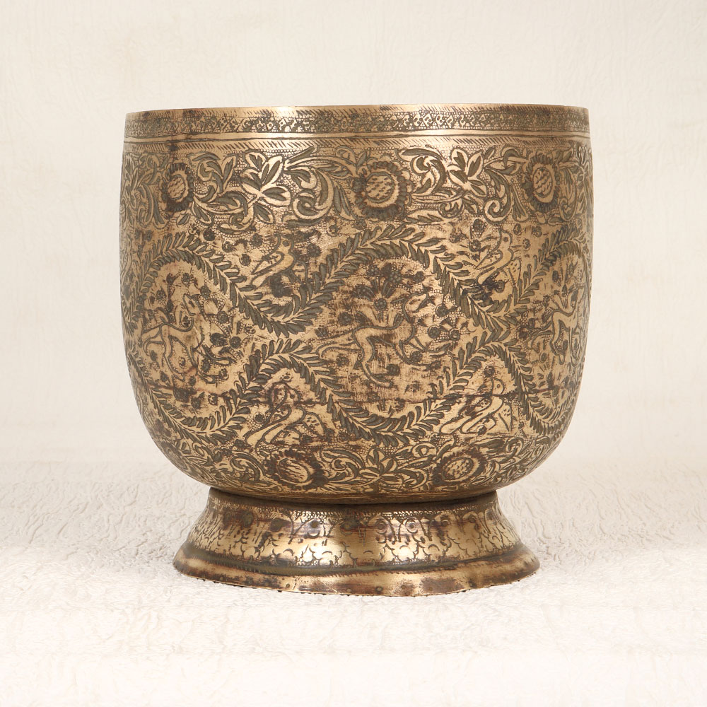 Adorn your living room with the timeless charm of this exquisite Vintage Brass Pot that is a masterpiece crafted by highly talented Indian artisans hailing from the culturally rich region of South India. Meticulously handmade from high-quality brass, the pot boasts a stunning antique brown finish that lends an aura of classic elegance to any setting. The pot is adorned with enchanting engravings featuring intricate depictions of birds and animals, showcasing the artisan’s exceptional craftsmanship and attention to detail. This one-of-a-kind piece seamlessly blends traditional aesthetics with modern sensibilities, making it a versatile addition to various environments, including homes, offices, restaurants, hotels, or cafes. Its purpose extends beyond mere decor – doubling as an indoor flower pot, the Vintage Brass Pot breathes life into any space it graces. This piece is not just an item of beauty but a symbol of heritage and artistry, making it an ideal addition to any vintage collection. Furthermore, with its timeless appeal, it serves as a thoughtful and meaningful gift for loved ones on special, festive, or auspicious occasions.