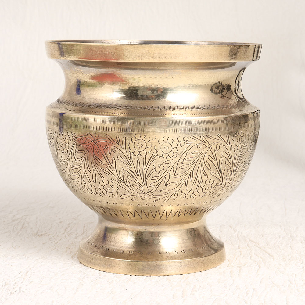 Buy a Vintage Brass Flower Pot online which is a true masterpiece meticulously crafted by highly talented Indian artisans hailing from the historic city of Hyderabad. This stunning piece is a testament to the timeless artistry of the subcontinent, combining the rich heritage of brass craftsmanship with intricate designs that are truly captivating. The shiny golden finish adds a touch of opulence to this already remarkable piece, making it a standout decor element for any setting. Crafted from high-quality brass, this flower pot is not only a symbol of elegance but also boasts durability and longevity. It is a versatile addition to your living space, suitable for home, office, restaurant, hotel, cafe, or shop, serving as a sophisticated vase for your favourite blooms or a statement piece in your vintage collection. Whether for personal enjoyment, exhibition, or as a heartfelt gift for your loved ones during special, festive, or auspicious occasions, this Vintage Brass Flower Pot is sure to leave a lasting impression.