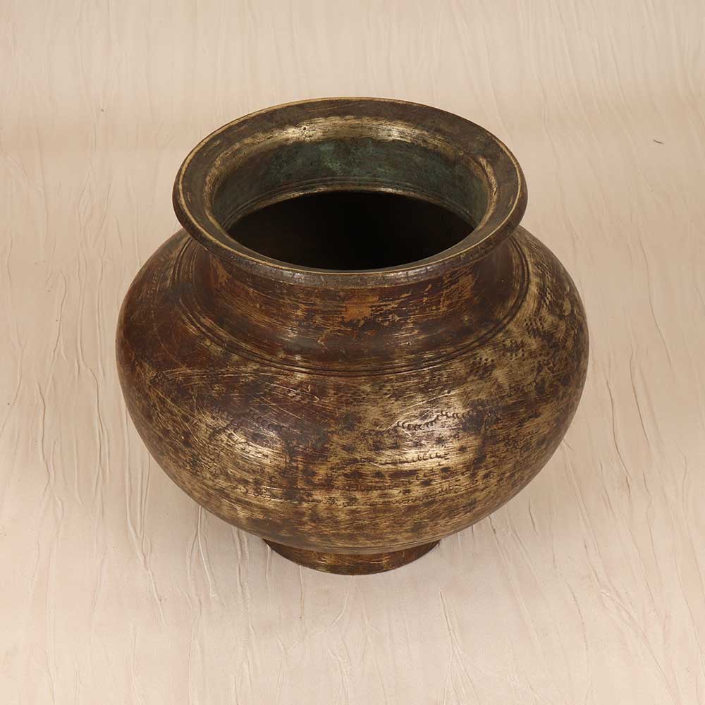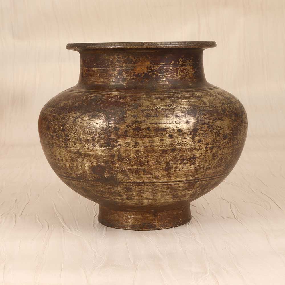 Transport yourself to a bygone era of devotion with this vintage brass holy water pot. Lovingly engraved with floral motifs in the Gujarat style, this vessel evokes the rich heritage of India's craftsmanship. This handcrafted pot allows you to uphold sacred rituals and connect with your faith. The intricate engravings impart a sense of reverence and meaning to the act of blessing yourself with holy water. Keep it by your door or in your place of worship as a beautiful vessel that enhances your religious devotion. Bring the aura of holiness into your home with this brass pot that celebrates the stunning artwork of Gujarat's skilled craftsmen. It makes a meaningful addition to your spiritual space.