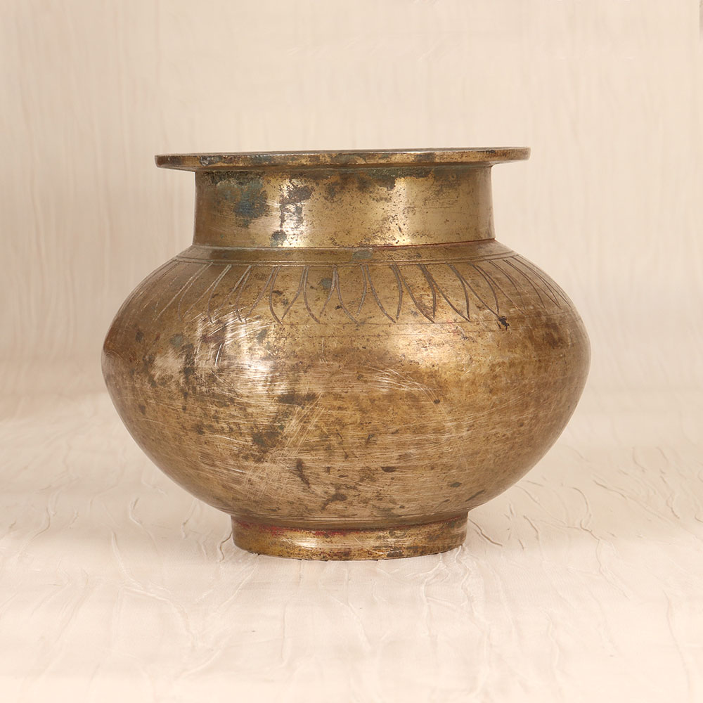 Crafted with meticulous attention to detail, this vintage brass holy water pot is a true work of art. Hailing from the vibrant region of Gujarat, India, it features intricate carvings that pay homage to the rich cultural heritage of the area. This holy water pot is more than just a functional vessel - it's a stunning centerpiece that will elevate your sacred space. The ornate carvings create a mesmerizing visual, drawing the eye and commanding attention. Whether you're an avid practitioner or simply appreciate fine craftsmanship, this piece will infuse your rituals with a profound sense of reverence. Designed to be a lifelong companion on your spiritual journey, this brass holy water pot is a must-have for anyone seeking to deepen their connection to the divine. Fill it with blessed water and use it to bless your home, cleanse your aura, or enhance your meditation practice. Its timeless beauty and superior construction ensure it will be a cherished heirloom for generations to come.