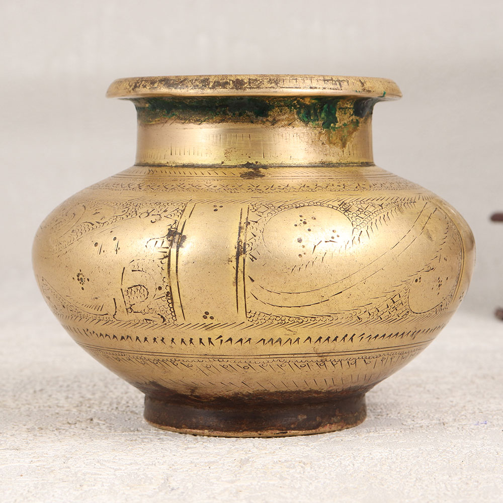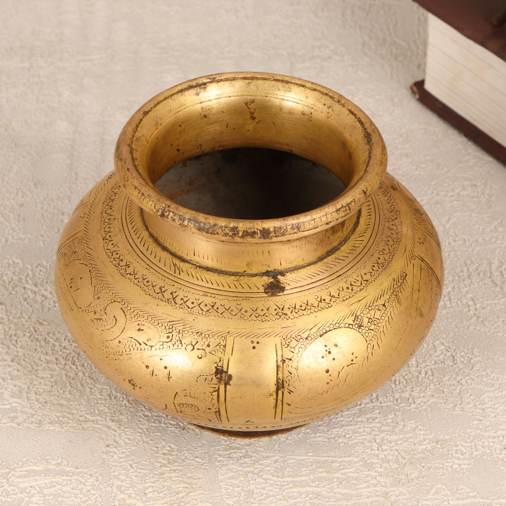 Enhance your spiritual space with this exquisite Vintage Brass Holy Water Pot that is a sacred Lota adorned with intricate engravings. Crafted by highly skilled Indian artisans from the vibrant region of Gujarat, this holy pot embodies centuries of tradition and craftsmanship. Made from high-quality brass, it boasts an antique brown finish that adds a touch of timeless elegance. Ideal for havans, auspicious occasions, and rituals, this handmade masterpiece serves as a symbol of divinity. Versatile in its use, the pot seamlessly transitions from sacred ceremonies to a stunning decorative element for your home, office, restaurant, hotel, or cafe. Its captivating design also allows it to double as an indoor flower pot, adding a unique charm to any space. This vintage treasure, with its rich cultural heritage, makes for a remarkable addition to any collector's repertoire. Share the blessings by gifting this holy water pot to your loved ones on special, festive, or auspicious occasions, offering them a piece of Indian tradition and artistry.