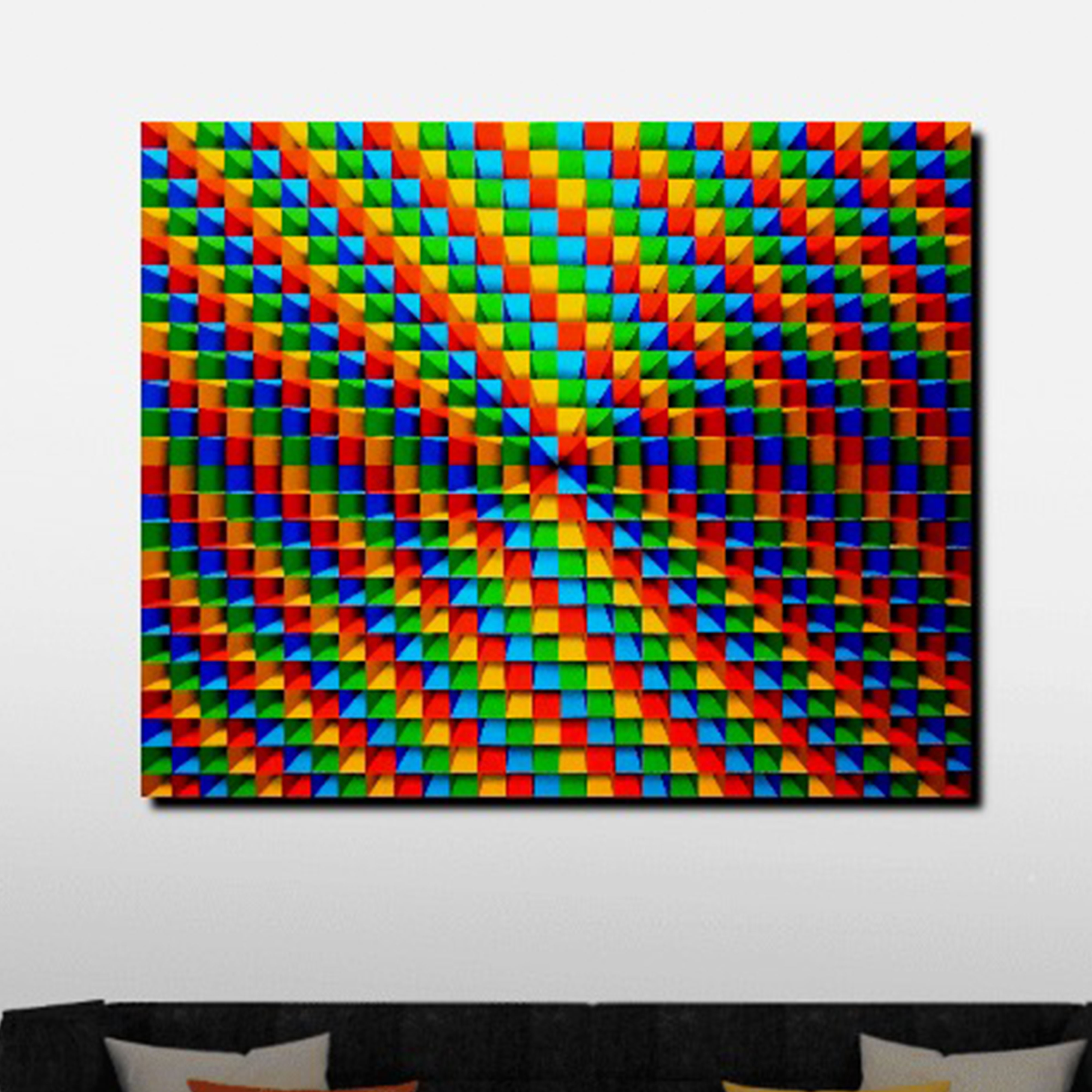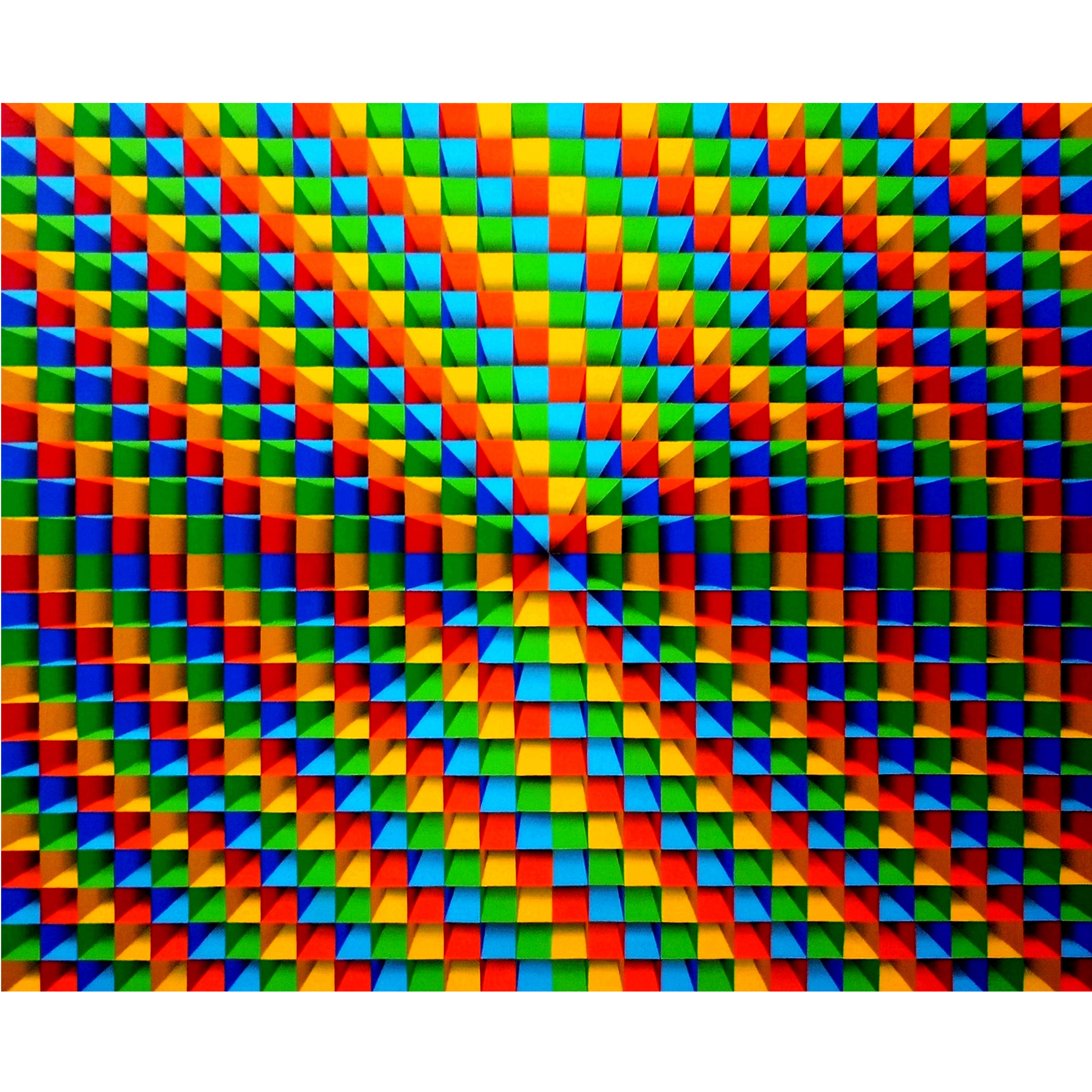 "Ensemble" is an electrifying acrylic on canvas painting that radiates rhythm, unity, and harmony through its hypnotic geometric patterns. The precise alignment of repeating triangular and rectangular shapes creates a powerful optical illusion, evoking a sense of movement and three-dimensionality. Vivid, energetic shades of orange, green, blue, and yellow harmoniously blend and contrast, symbolizing voices and instruments converging into a singular orchestral performance. The symmetry and meticulous arrangement reflect synchronization and collective purpose, transforming the canvas into a visual symphony. "Ensemble" invites viewers into an immersive experience, resonating with the harmonious interplay of form, color, and rhythm.