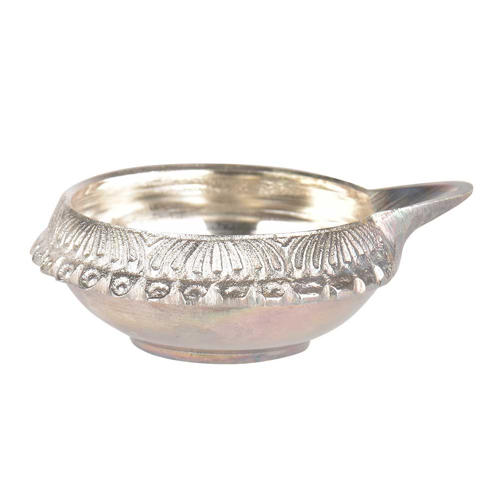 Traditional Sacred Prayer Collection Silver plated Kuber Deep Diya is crafted for your daily prayers from high-grade Brass and embellished With an ornate pattern and lovingly etched With a simple yet elegant pattern.