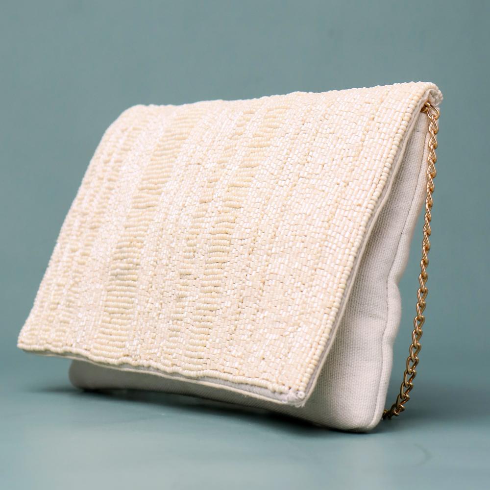 Ethereal Ivory Minimal Beaded Clutch with Chain Strap