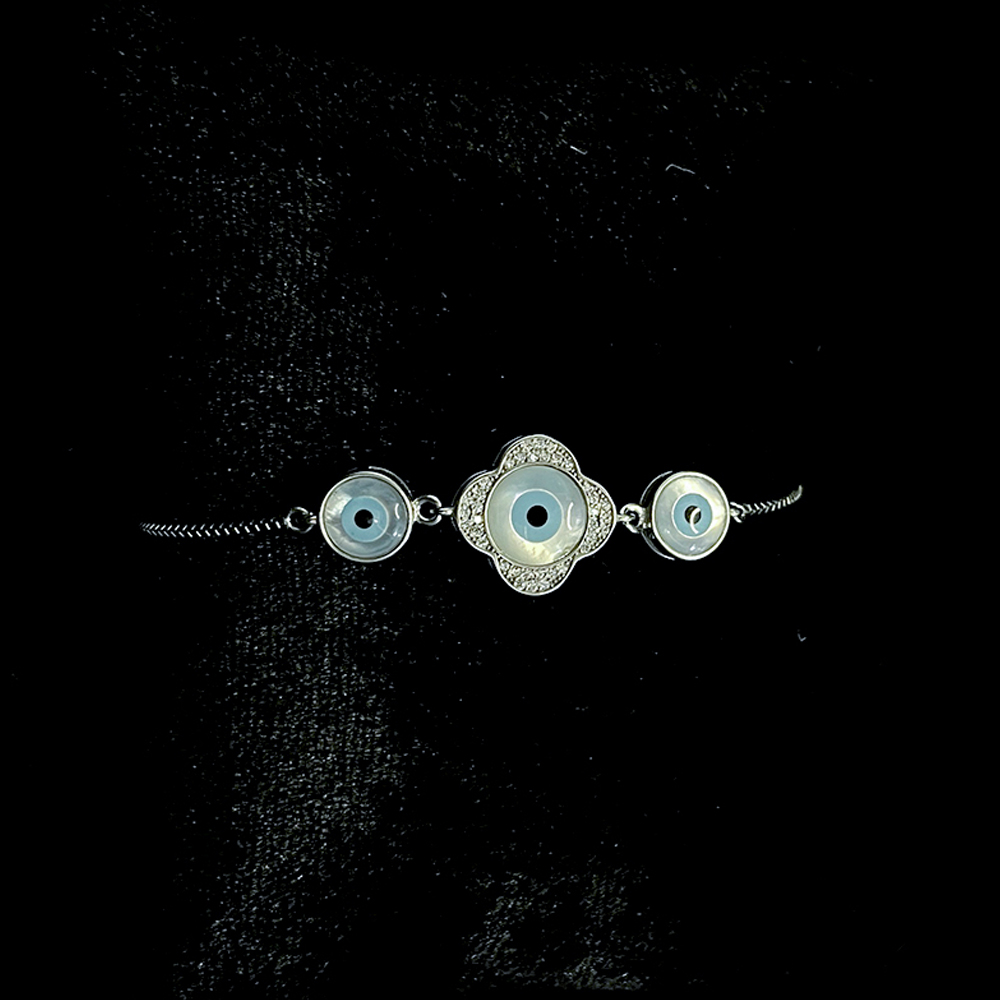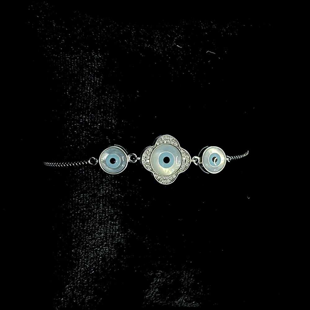 The bracelet presents a central four petal inspired form surrounding the evil eye symbol, creating a calm and harmonious visual structure. This design connects protective belief with gentle decorative detailing without overpowering the wrist.