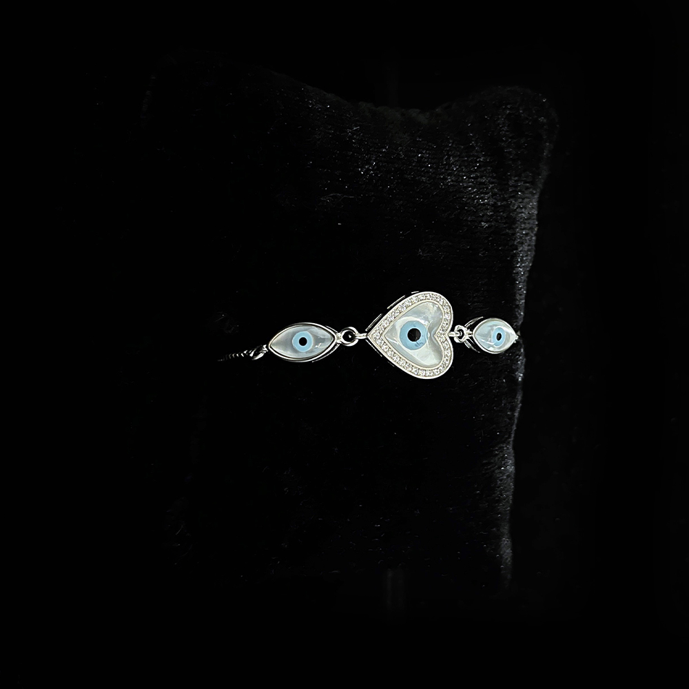 The bracelet highlights a heart inspired centerpiece framing the evil eye motif, creating a connection between emotional expression and symbolic belief. The design remains refined and wearable, offering meaning without overpowering the wrist.