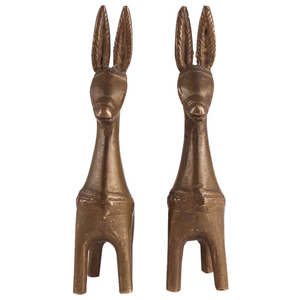 Ancient design overly dramatic solid brass style  Bankura Horse figurines with a fantastic design. This exaggerated form of animals with decorative saddle and harness has a beautiful South American vibe. These statues would make an excellent present for a loved one, a traveler, or family and friends. Excellent antiqued brass with age-related patina and oxidation. Beautiful decorative display for home, work, or office, among other places. It is sold in pairs.