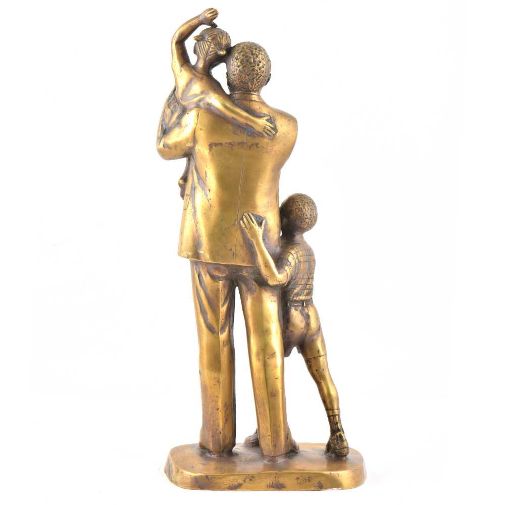 A lovely looking handmade brass statue of a father with his two children one in his lap and the other hugging him tightly. The father is properly dressed in a suit wearing glasses . A lovely gifting option on fathers day or for friends and relatives where the concept of joint family and close knit family is still prevalent.