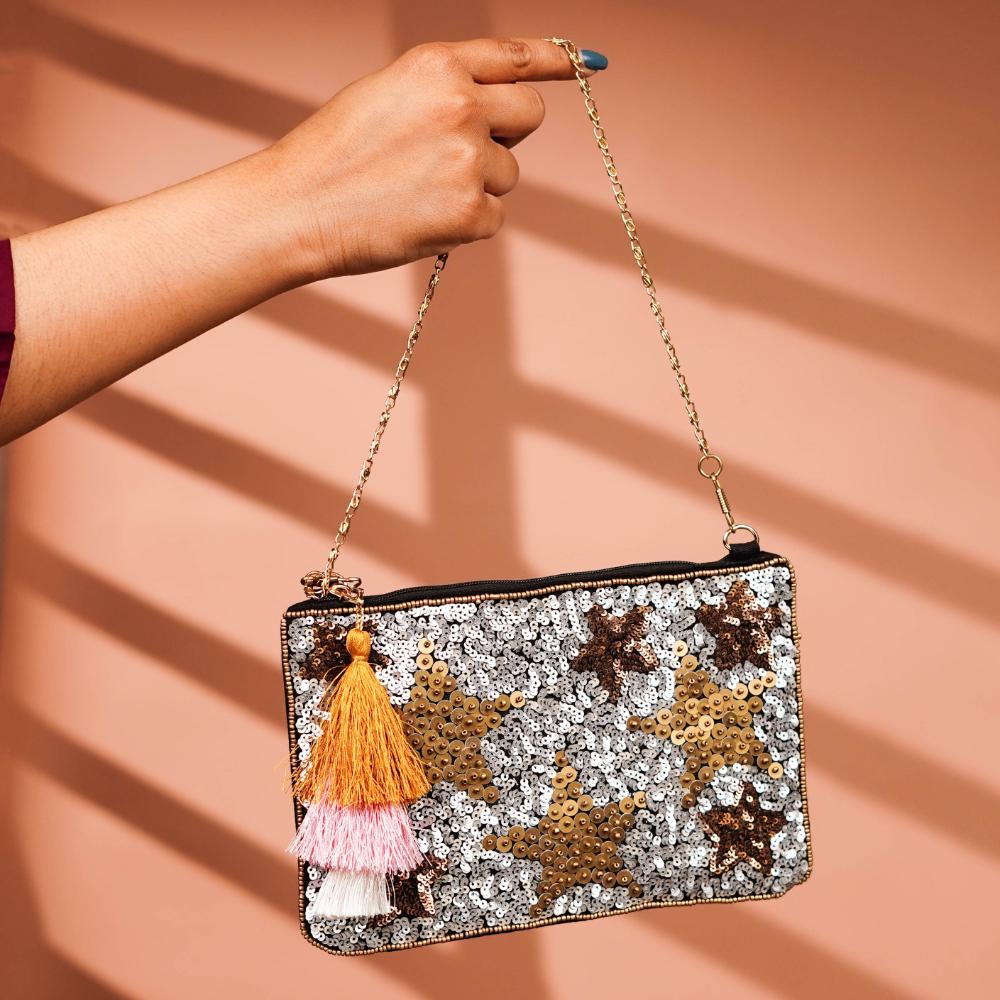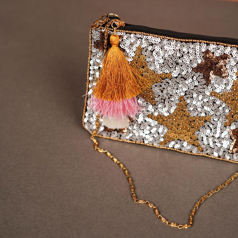 This eye-catching cotton and beads handbag brings the magic of the night sky to your accessory collection. Adorned with shimmering silver sequins and golden star motifs, it creates a celestial statement that sparkles from every angle. The base cotton fabric provides a soft structure, while the hand-embroidered beads add a luxe, tactile element. A vibrant tassel in shades of mustard, pink, and ivory adds playful contrast, and the gold chain enhances the overall glamour. Ideal for evening parties or festive events, this bag ensures you shine bright wherever you go.