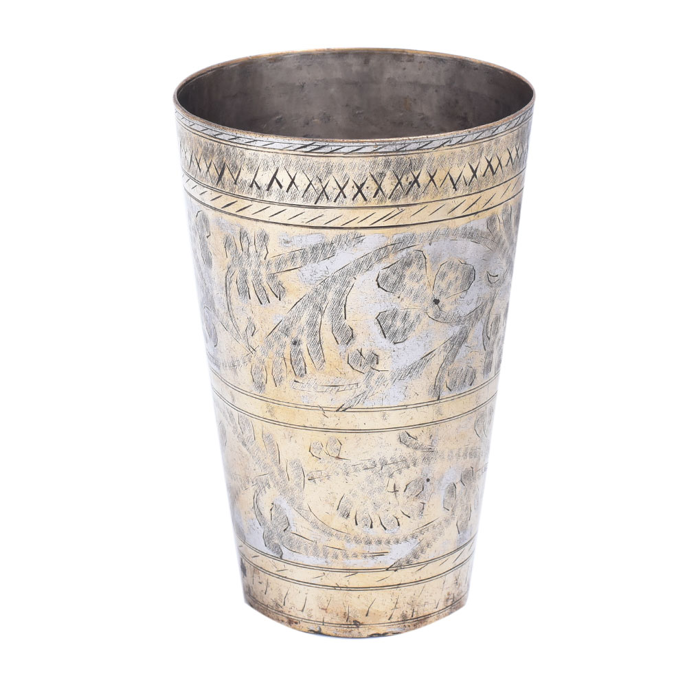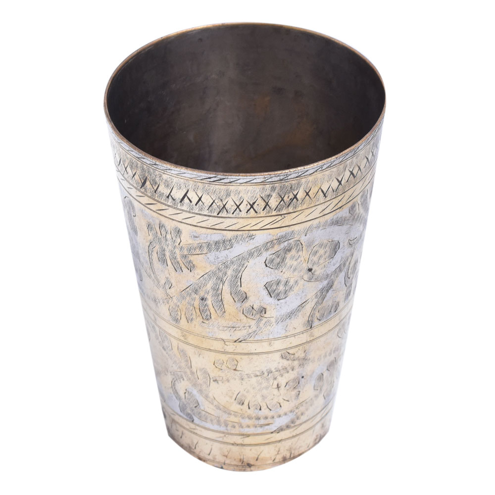 Brass north indian Lassi glass carved with  leafy pattern in border and decorated With gold highlights. This traditional lassi glass is a strong, elegant, and lovely addition to any home. It is frequently quickly transformed into a lovely day of remembrance, Wedding, Diwali, or Valentine gift item.