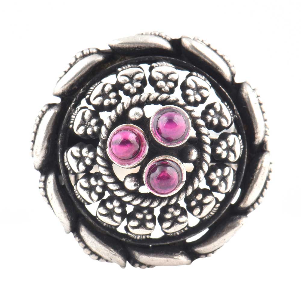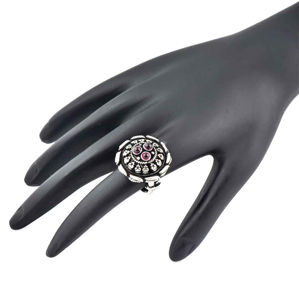 Fashionable handmade 92.5 Sterling Silver ring is adjustable with three small amethyst roped with designer leaf motifs surrounded by embossed design is very suitable for any grand part, reception, engagement, birthday , picnic or social function.