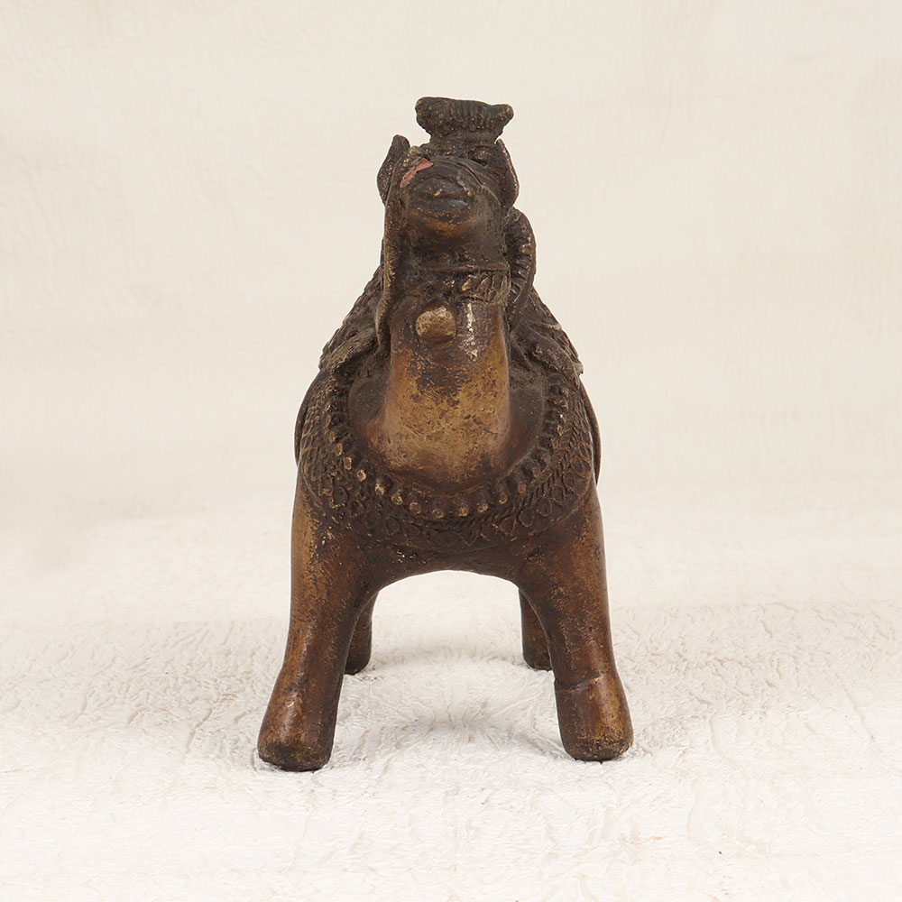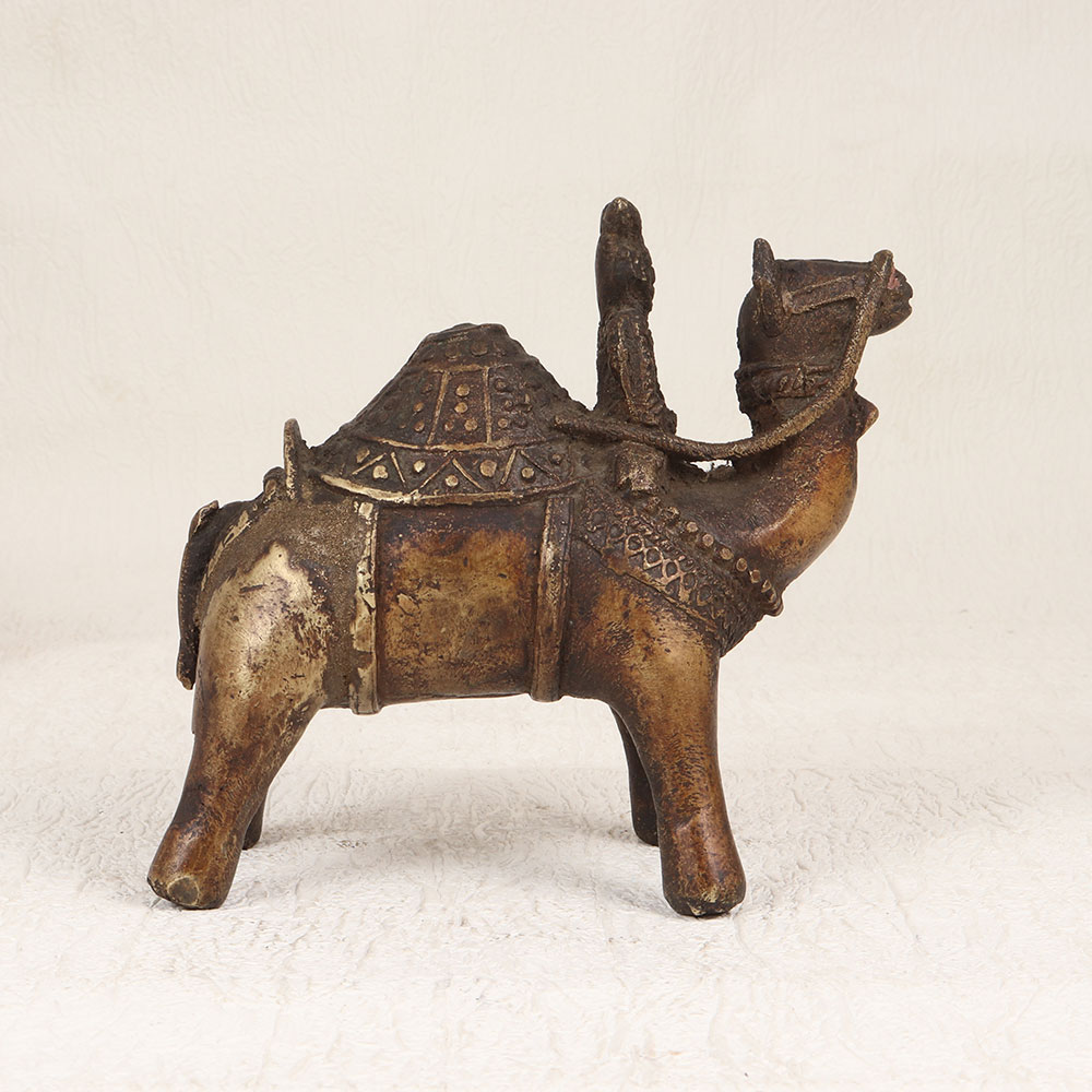 Transport yourself to the enchanting landscapes of Central India with this exquisite vintage brass camel with rider statue. Meticulously handcrafted by highly skilled and experienced Indian artisans, this masterpiece exudes timeless charm with its antique brown finish. Crafted from high-quality brass, the statue showcases the artisanal prowess of Central Indian craftsmanship. With its intricate detailing and nostalgic appeal, this camel and rider statue is a perfect addition to your home, office, restaurant, hotel, or cafe for a touch of cultural elegance. Its versatile design complements various settings, making it an ideal choice for decoration. Elevate your vintage collection with this unique piece that effortlessly blends tradition and artistry. Not just a decor item, this statue makes for a thoughtful and meaningful gift for your loved ones on special, festive, or auspicious occasions.
