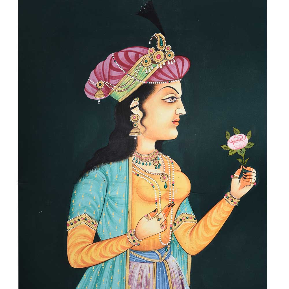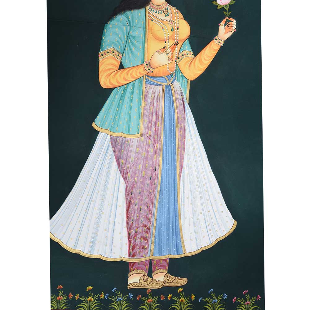 • Fine Canvas Painting Of Indian Mughal Queen Holding A flower In Hand