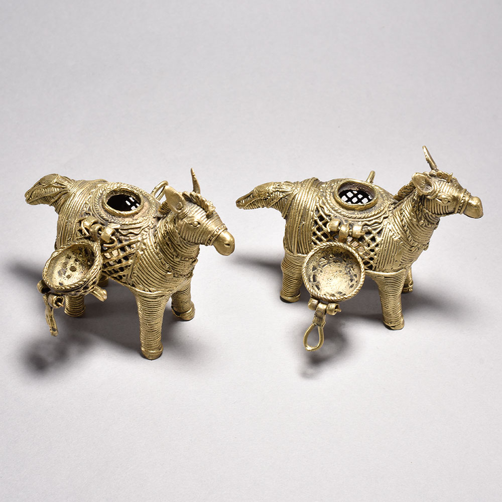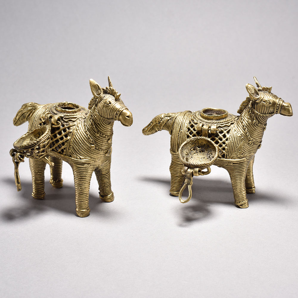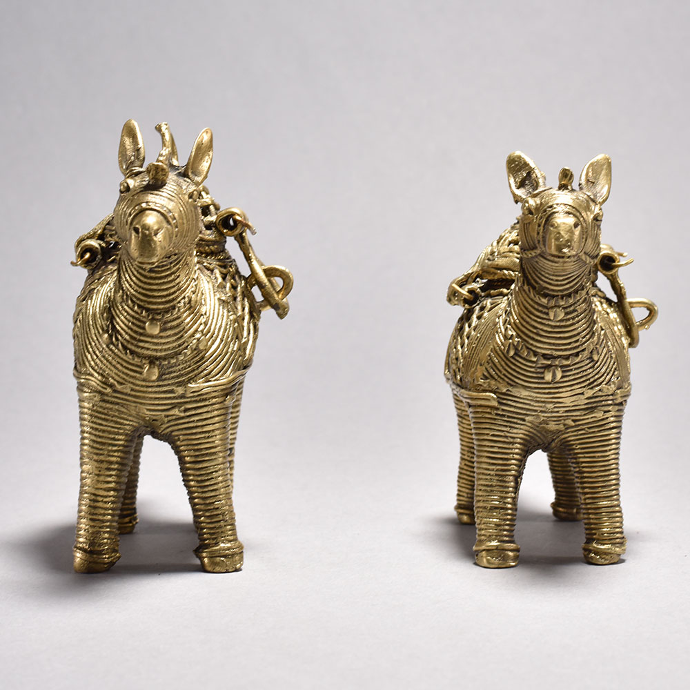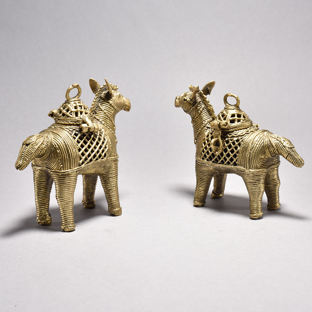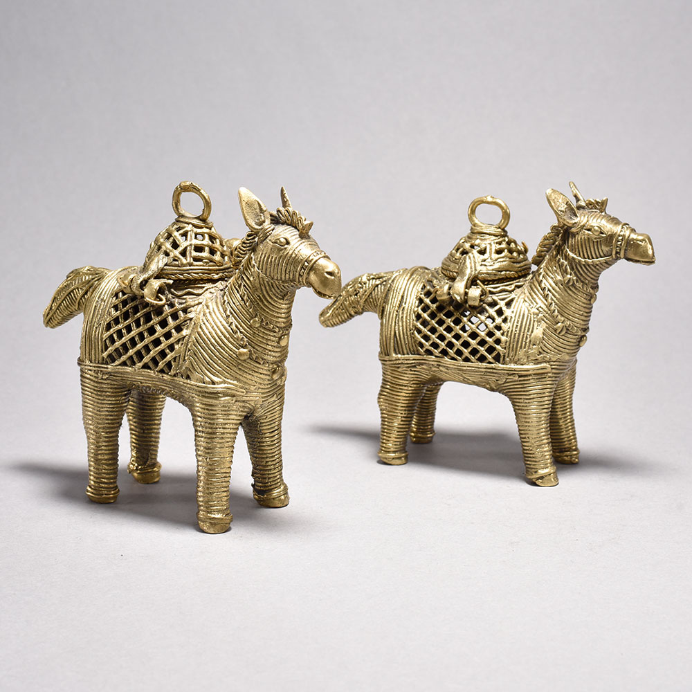 Bring the vibrant spirit of India's tribal art into your home with this captivating pair of metal horses.These striking tribal art horses from Orissa immortalize the cultural significance of these noble animals in Indian culture. The meticulously detailed design and inclusion of the ornamental boxes highlight the deep-rooted traditions that inspired their creation. Whether displayed proudly in your living space or gifted to a loved one, these horses will bring a piece of India's vibrant heritage into your world. Intricately crafted using the ancient lost wax casting process This timeless piece is handcrafted by skilled artisans using time-honored techniques, ensuring each creation is truly one of a kind. Its versatile design makes it suitable for living rooms, bedrooms, offices, or meditation spaces, bringing a sense of heritage and style wherever it is displayed. This timeless piece is handcrafted by skilled artisans using time-honored techniques, ensuring each creation is truly one of a kind. Its versatile design makes it suitable for living rooms, bedrooms, offices, or meditation spaces, bringing a sense of heritage and style wherever it is displayed.