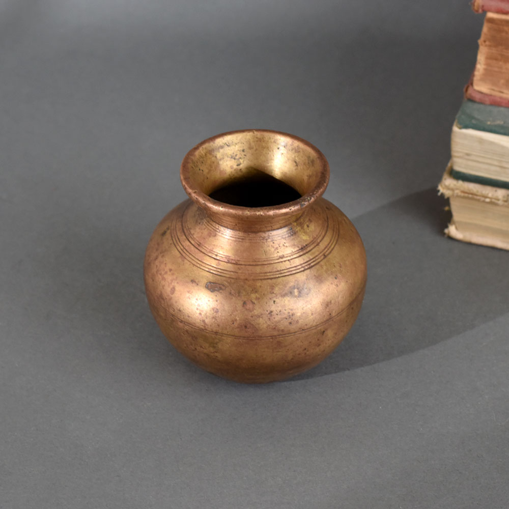 This antique brass holy water pot is a beautifully handcrafted piece inspired by traditional Indian design. Its rounded shape and subtle engraved lines reflect cultural heritage and artisanal skill. Perfect for use in rituals, poojas, and temple ceremonies, this pot also serves as a vintage decorative accent for your home. The solid brass construction ensures durability and a timeless golden finish that adds elegance to any sacred space. A meaningful addition to your spiritual collection or a thoughtful gift for religious occasions.
