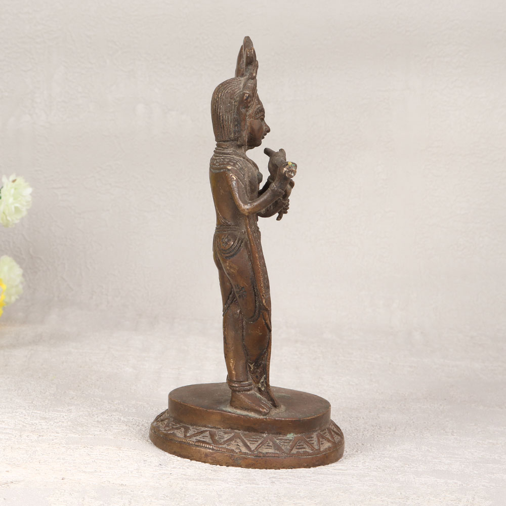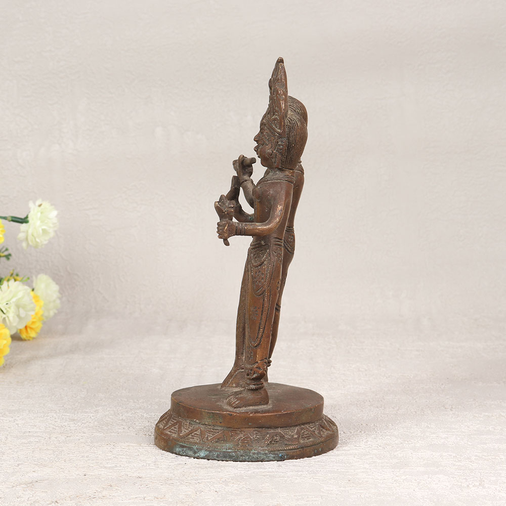 A brass statue of Lord Krishna and Goddess Radha that is a masterpiece crafted by skilled Indian artisans in the revered Bengali Art tradition. Standing gracefully on a meticulously designed platform, the divine couple emanates timeless elegance and spiritual energy. The statue boasts an antique brown finish, adding a touch of vintage charm that seamlessly blends tradition with sophistication. Handmade with precision and care, this high-quality brass sculpture captures the intricate details of Lord Krishna and Goddess Radha, showcasing the artisan’s dedication to their craft. The statue is versatile, making it a perfect addition to your home, office, restaurant, hotel, or cafe prayer room. Its aesthetic appeal and spiritual significance make it a thoughtful gift for your loved ones on special, festive, or auspicious occasions. This brass masterpiece not only serves as a symbol of devotion but also doubles as a unique piece for vintage collectors.