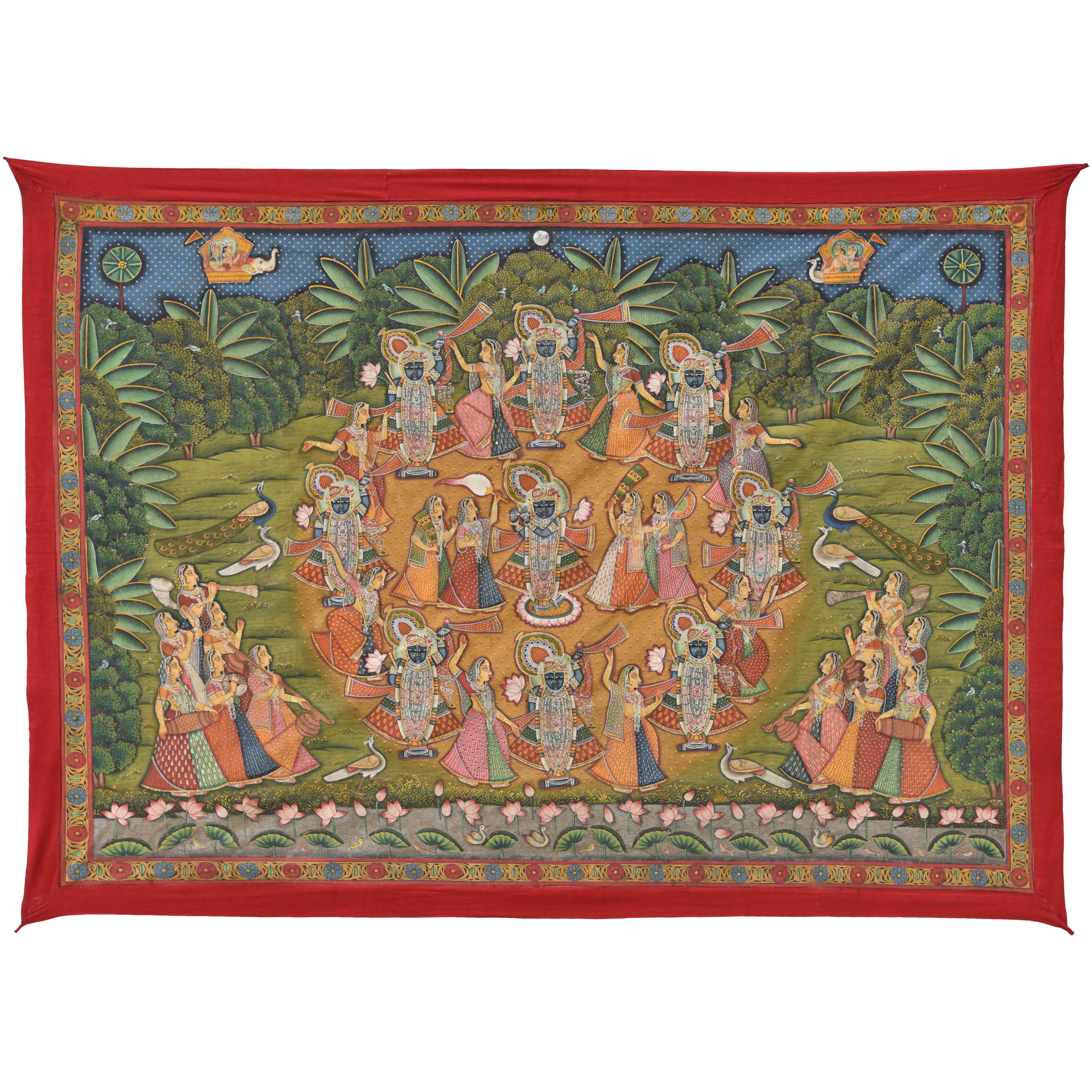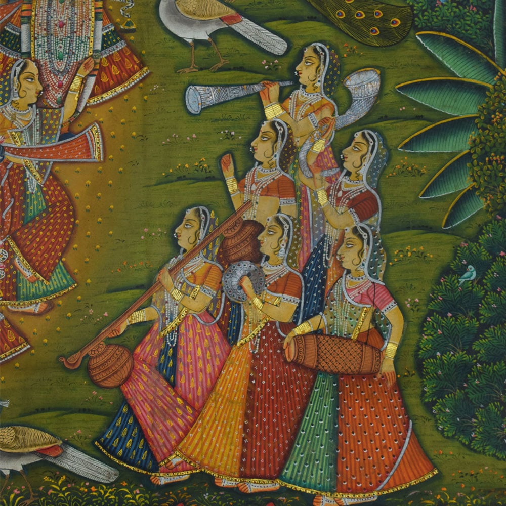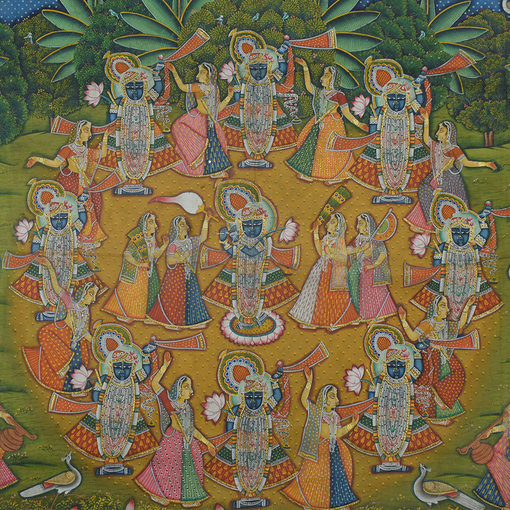 A beautiful depiction of Shreenath Ji along with his Gopis shown dancing, playing instruments and enjoying around him