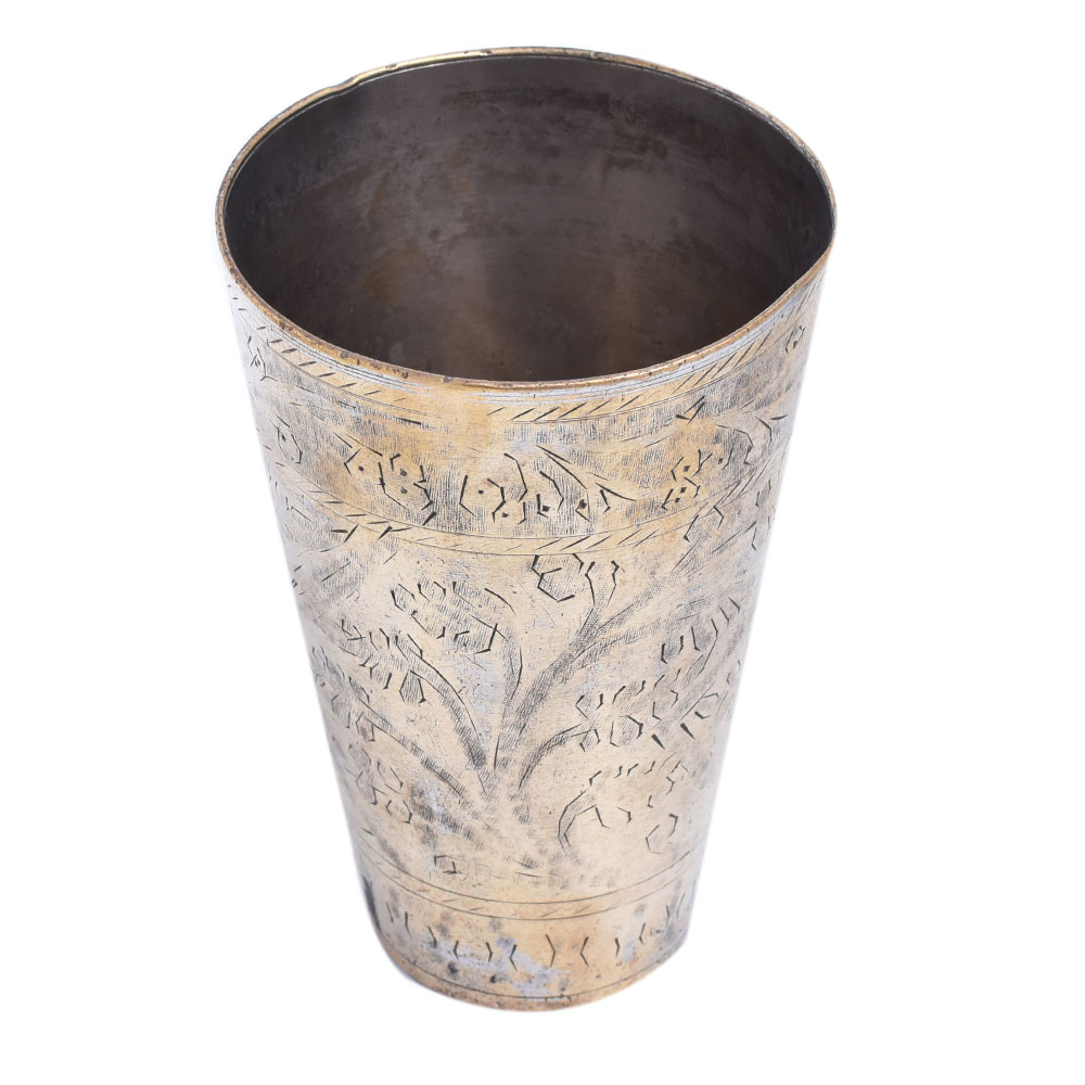 Floral Brass Hand Carved Lasssi Glass in contemporary design make excellent vases or beakers for storing paint brushes or kitchen utensils; they are sturdy, heavy, and one-of-a-kind, and are ideal for home décor and personal gifting. Excellent for Vintage Lovers. A true Collectors Piece. The item is extremely durable, elegant, and would make an excellent addition to your Home Decor. It can easily be transformed into a lovely Anniversary, Wedding, Diwali, or Valentine's Day gift.