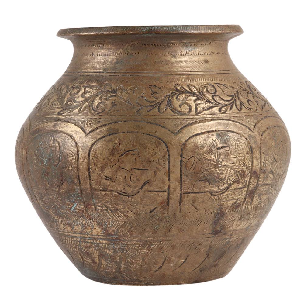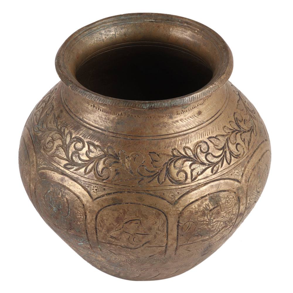 This lota is known as Gundu Lota (Gundu in Telugu means round), and it gets its name from its round belly. It has no lid and is picked up by wrapping five fingers around its rim. It has very finely carved designs all around its body and has a very appealing appearance. The latest Lotas will have sharp and deep styles.