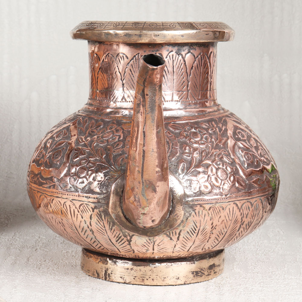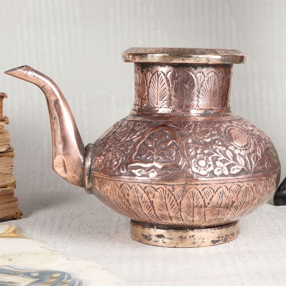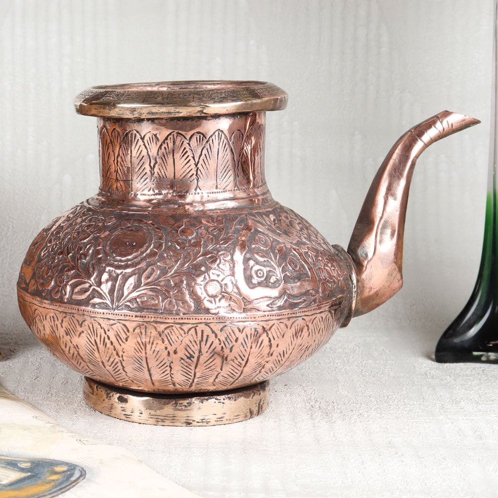 Buy a Copper Water Pot online from our website which is a true embodiment of artistry and tradition. Handcrafted by talented Indian artisans from Hyderabad, this elegant pot exudes timeless charm and sophistication. Crafted from high-quality copper, this pot is a testament to the rich heritage of Islamic Art, with its intricate designs and antique brown finish that add a touch of opulence to any space. The spout's graceful curvature enhances its functionality, making pouring effortless and elegant. Versatile and multi-purpose, this copper pot seamlessly complements various settings, including homes, offices, restaurants, hotels, and cafes. It serves as an exceptional decorative piece, adding a touch of cultural richness to any environment. Additionally, it can be used as a striking flower pot or as a vessel during sacred rituals, holding holy water with reverence. This exquisite copper pot makes for an unforgettable gift, perfect for special, festive, or auspicious occasions. Share the beauty of Indian craftsmanship and the warmth of your love with your cherished ones through this timeless piece of art.