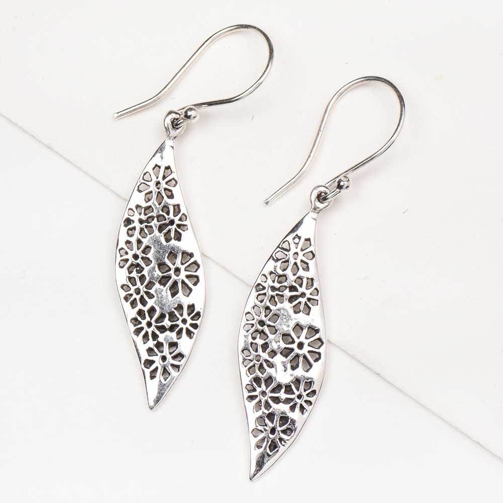 • Floral Filigree 92.5 Sterling Silver Earrings Long Oval Drop Earrings
