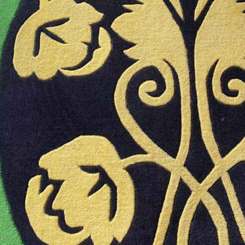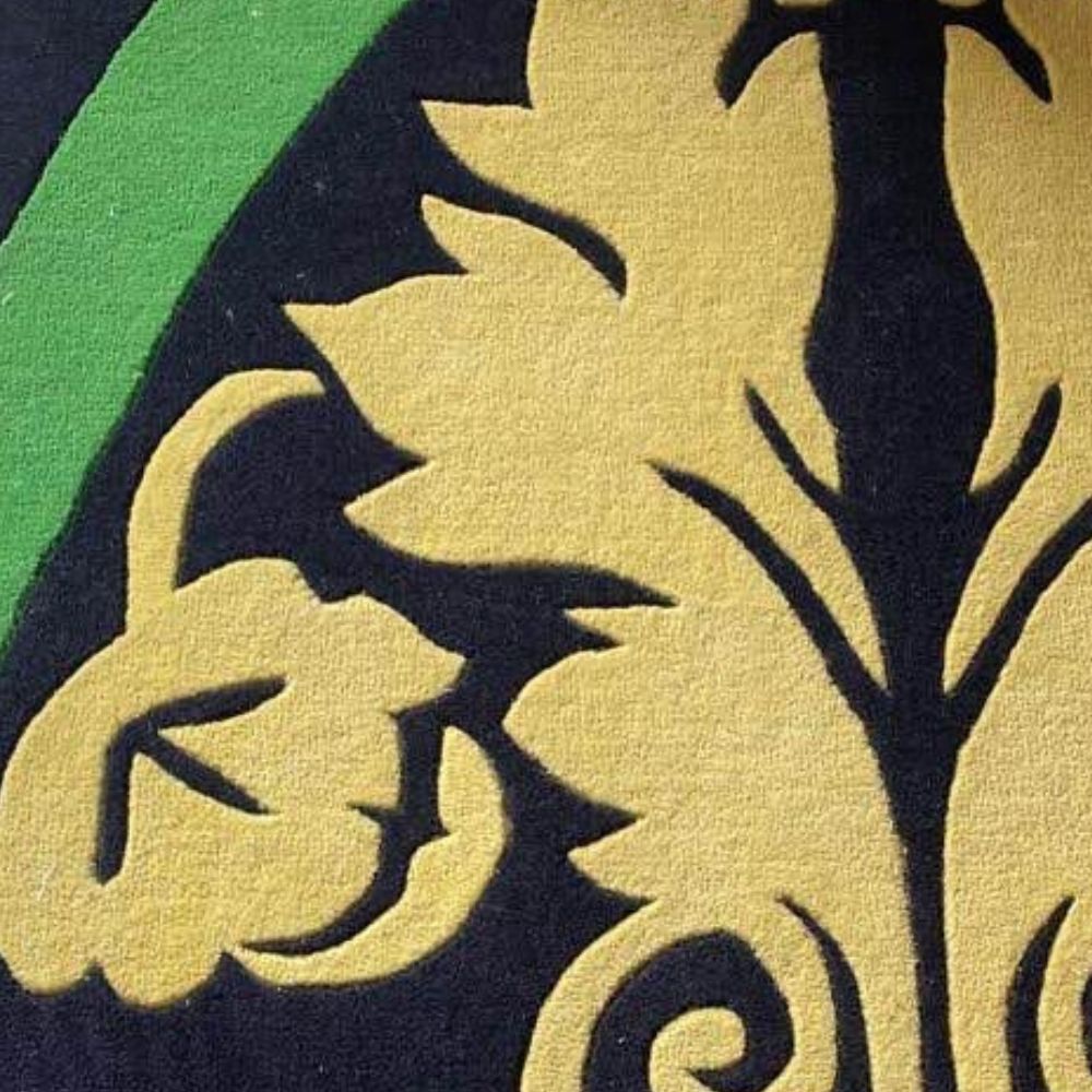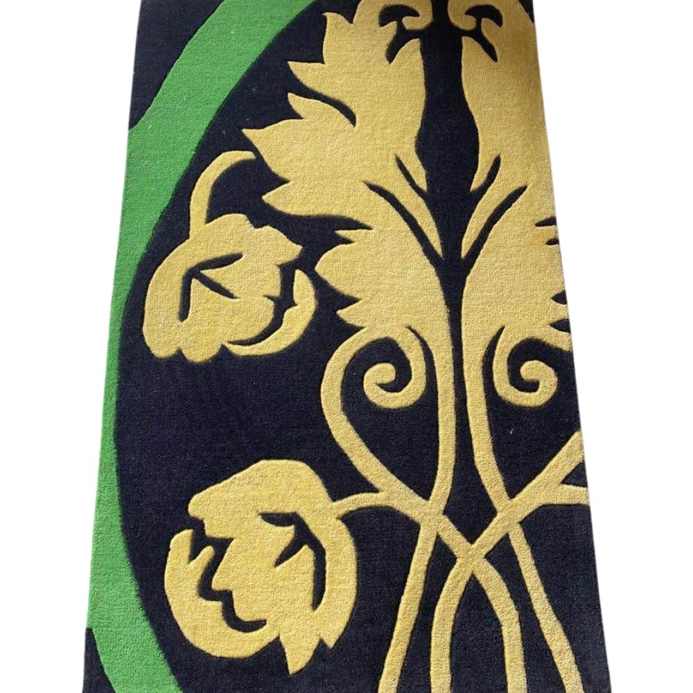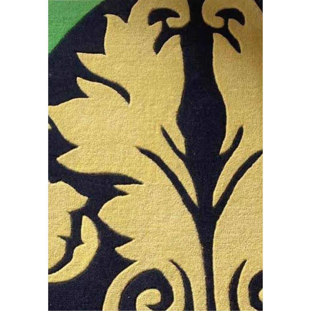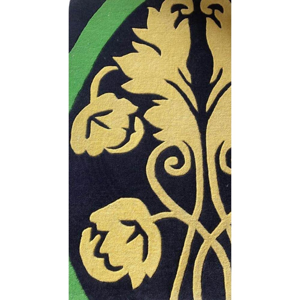 Design Inspiration Bring bold character to your home with this hand-tufted wool rug featuring a striking floral-inspired design. The deep black background provides a dramatic base, while sunny yellow flowers and a vibrant green border accent create a balanced, modern statement. Perfect for adding warmth and elegance to living rooms, bedrooms, or creative spaces. Cotton backing adds strength and durability. Made using the traditional hand-tufting technique, where artisans carefully punch wool into a stretched cloth to create the detailed pattern. Finished with precision carving and trimming for clean lines and a polished look. Available Sizes This design can be made in a wide variety of sizes and shapes including rectangular, square, round, and runner formats. Standard sizes include: 2x3 ft, 3x5 ft, 4x6 ft, 5x7 ft, 6x9 ft, 8x10 ft, 9x12 ft, 12x15 ft, plus custom dimensions upon request. Color Palette: Black (Primary Background): Deep, bold base that makes the floral details pop. Golden Yellow (Floral Pattern): Bright and warm, forming the main flower motifs. Leaf Green (Border Accent): Fresh, lively shade adding contrast and framing the design. Customization Choose.