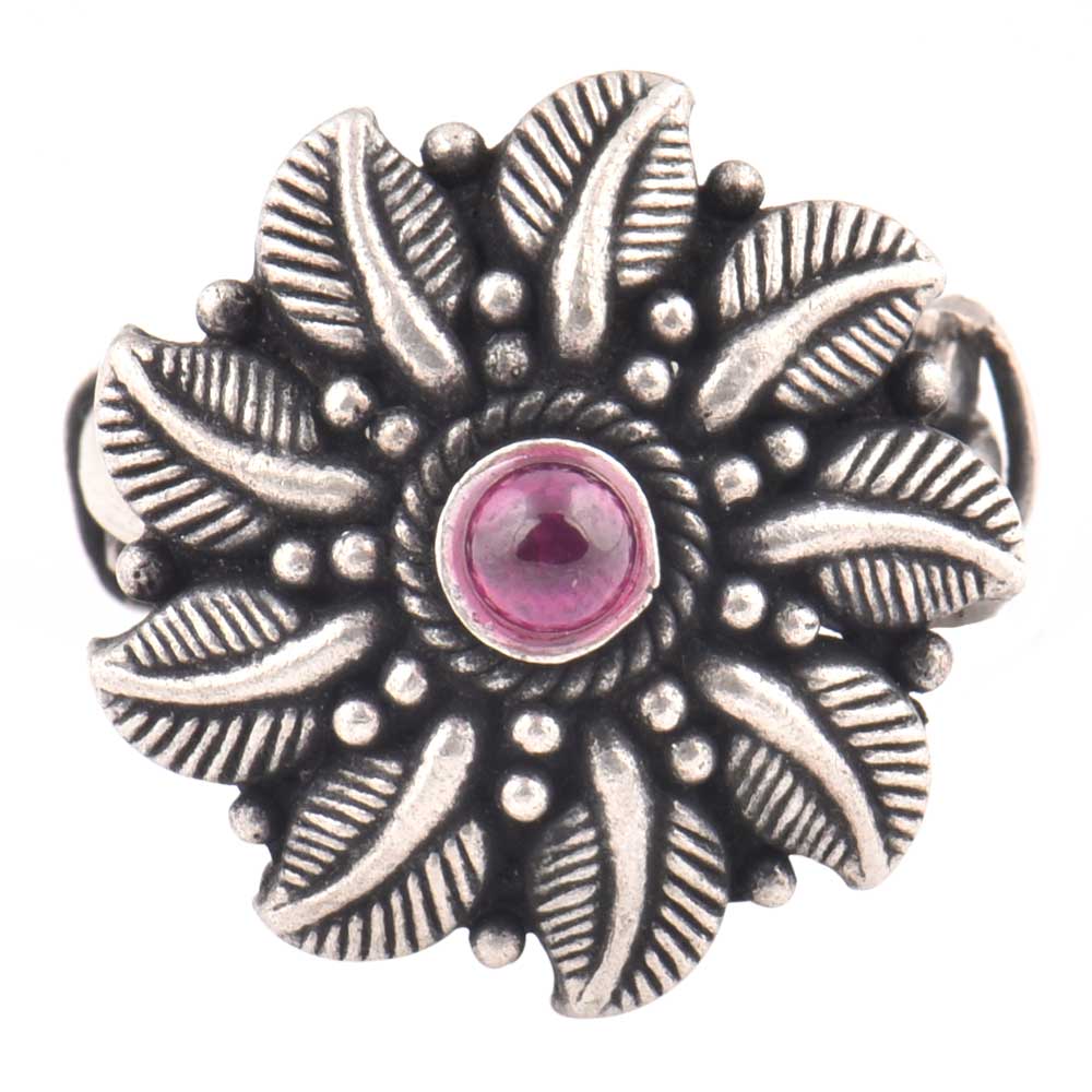 Floral Leaves Oxidized 92.5 Sterling Silver Ring Adjustable With Amethyst Stone For Women (Free Size)